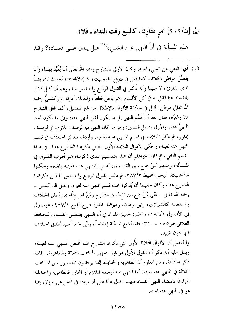 والحاصل أن الأقوال الثلاثة الأُول التي ذكرها الشارح هنا تخص المنهي عنه لعينه، ويدل عليه أنه ذكر أن القول الأول هو قول جمهور المذاهب الثلاثة والظاهرية، وفاته ذكر الحنابلة. ومن المعلوم أن الظاهرية والحنابلة إنما يوافقون الجمهور من المذاهب الثلاثة في المنهي عنه لعينه، أما المنهي عنه لوصفه الملازم أو المجاور فالظاهرية والحنابلة يقولون باقتضاء النهي الفساد فيهما، فدل هذا على أن مراده في النقل عن هؤلاء إنما هو في المنهي عنه لعينه.