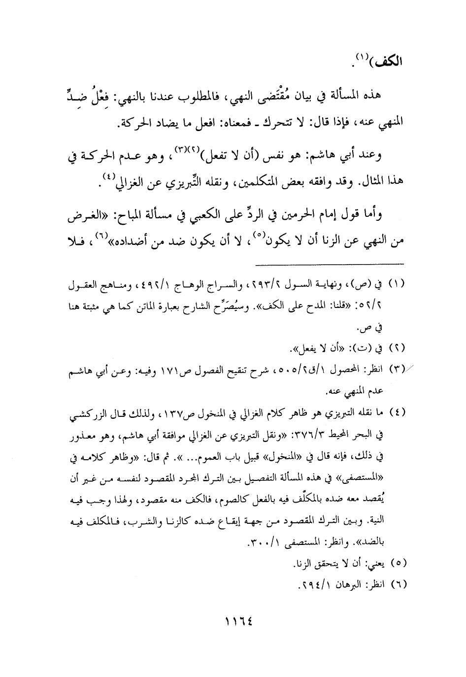 وعند أبي هاشم: هو نفس (أن لا تفعل) (¬٢) (¬٣)، وهو عدم الحركة في هذا المثال. وقد وافقه بعض المتكلمين، ونقله التِّبريزي عن الغزالي (¬٤).