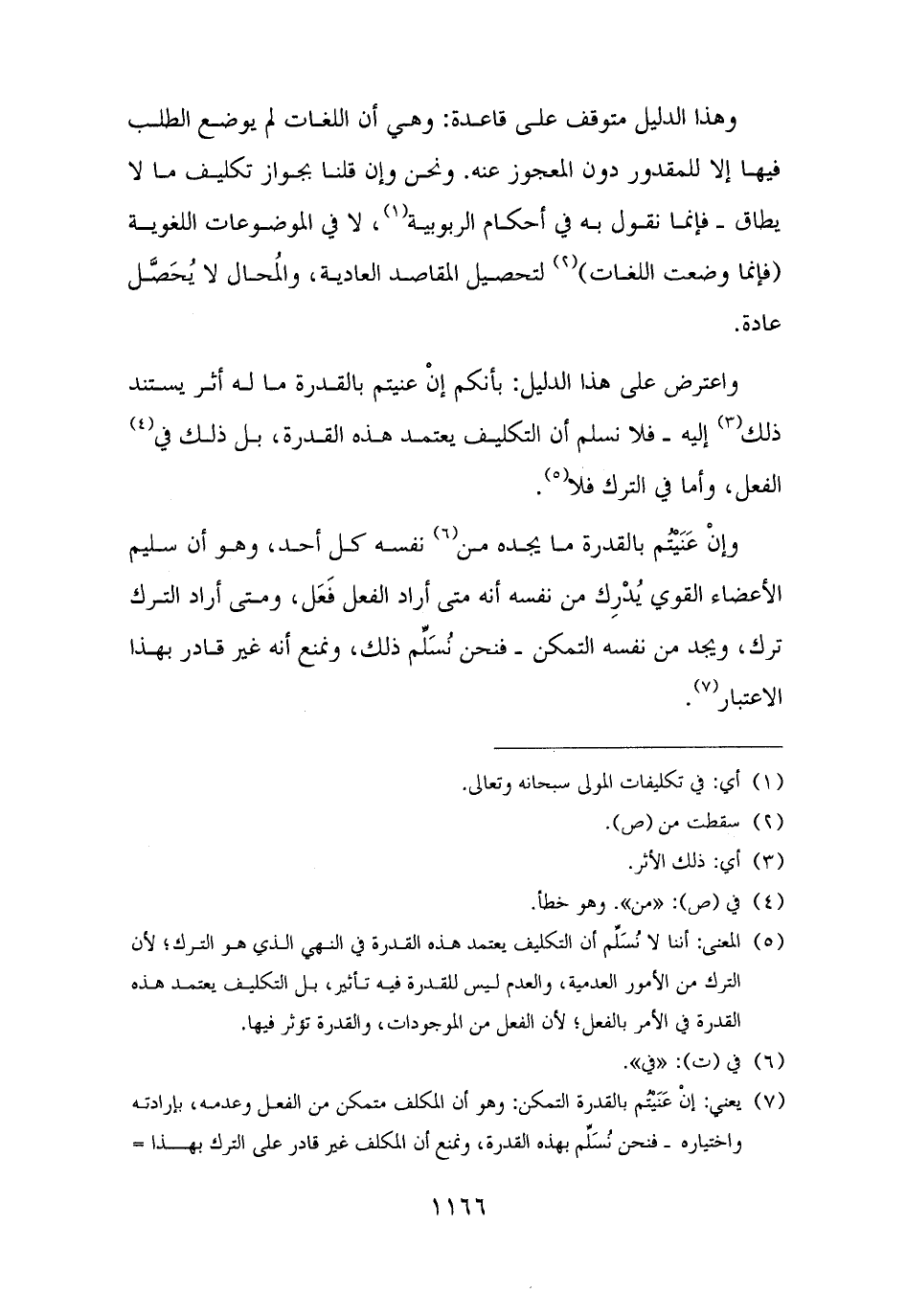 (¬٥) المعنى: أننا لا نُسَلِّم أن التكليف يعتمد هذه القدرة في النهي الذي هو الترك؛ لأن الترك من الأمور العدمية، والعدم ليس للقدرة فيه تأثير، بل التكليف يعتمد هذه القدرة في الأمر بالفعل؛ لأن الفعل من الموجودات، والقدرة تؤثر فيها.
