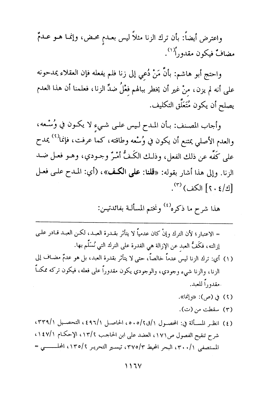 (¬١) أي: ترك الزنا ليس عدمًا خالصًا، حتى لا يتأثر بقدرة العبد، بل هو عدمٌ مضاف إلى الزنا، والزنا شيء وجودي، والوجودي يكون مقدورًا على فعله، فيكون تركه ممكنًا مقدورًا للعبد.