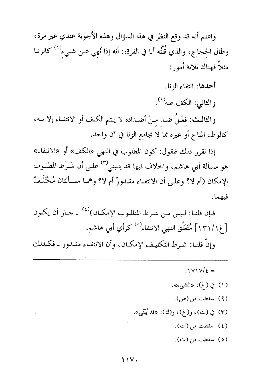 فإن قلنا: ليس من شرط المطلوب الإمكان) (¬٤) - جاز أن يكون مُتَعَلَّق النهي الانتفاء (¬٥) كرأي أبي هاشم.