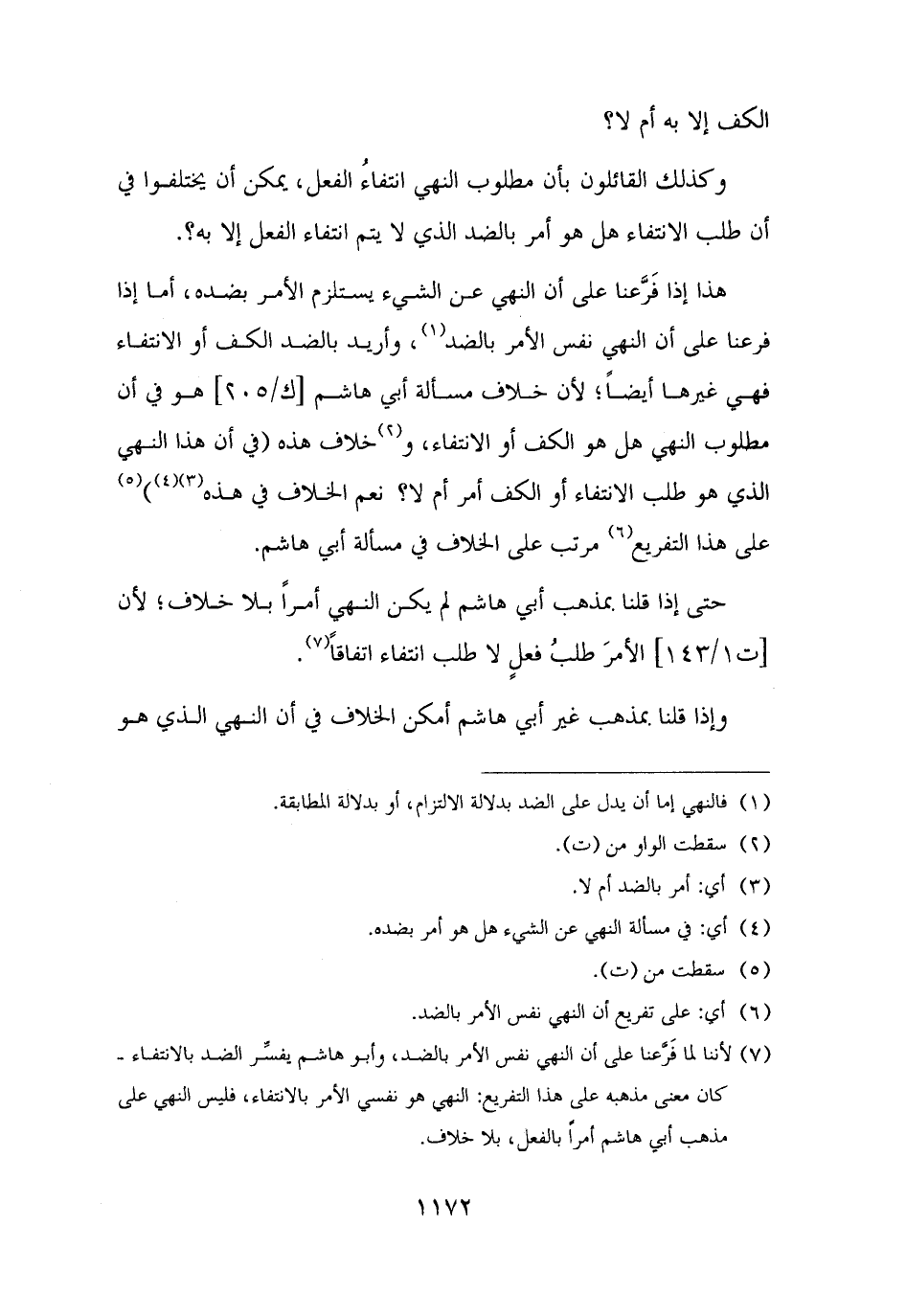 (¬٧) لأننا لما فَرَّعنا على أن النهي نفس الأمر بالضد، وأبو هاشم يفسِّر الضد بالانتفاء - كان معنى مذهبه على هذا التفريع: النهي هو نفسي الأمر بالانتفاء، فليس النهي على مذهب أبي هاشم أمرًا بالفعل، بلا خلاف.
