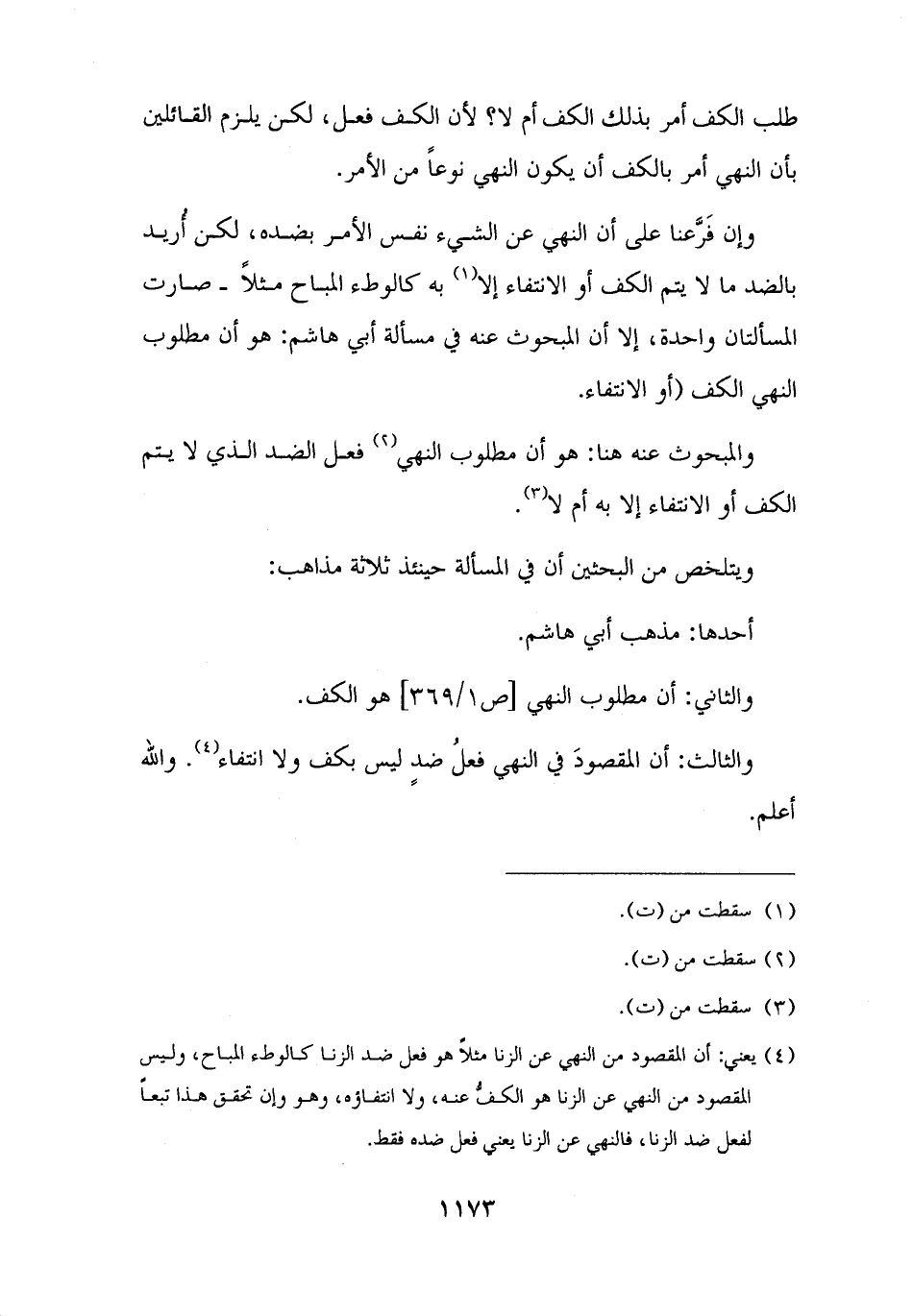 (¬٤) يعني: أن المقصود من النهي عن الزنا مثلًا هو فعل ضد الزنا كالوطء المباح، وليس المقصود من النهي عن الزنا هو الكفُّ عنه، ولا انتفاؤه، وهو وإن تحقق هذا تبعًا لفعل ضد الزنا، فالنهي عن الزنا يعني فعل ضده فقط.