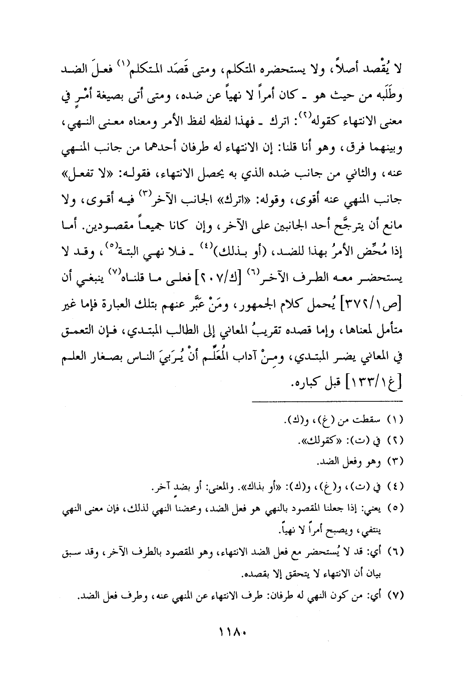لا يُقْصد أصلًا، ولا يستحضره المتكلم، ومتى قَصَد المتكلم (¬١) فعلَ الضد وطَلَبه من حيث هو - كان أمرًا لا نهيًا عن ضده، ومتى أتى بصيغة أمْرٍ في معنى الانتهاء كقوله (¬٢): اترك - فهذا لفظه لفظ الأمر ومعناه معنى النهي، وبينهما فرق، وهو أنا قلنا: إن الانتهاء له طرفان أحدهما من جانب المنهي عنه، والثاني من جانب ضده الذي به يحصل الانتهاء، فقوله: "لا تفعل" جانب المنهي عنه أقوى، وقوله: "اترك" الجانب الآخر (¬٣) فيه أقوى، ولا مانع أن يترجَّح أحد الجانبين على الآخر، وإن كانا جميعًا مقصودين. أما إذا مُحِّض الأمرُ بهذا للضد، (أو بذلك) (¬٤) - فلا نهي البتة (¬٥)، وقد لا يستحضر معه الطرف الآخر (¬٦) فعلى ما قلناه (¬٧) ينبغي أن يُحمل كلام الجمهور، ومَنْ عَبَّر عنهم بتلك العبارة فإما غير متأمل لمعناها، وإما قصده تقريبُ المعاني إلى الطالب المبتدي، فإن التعمق في المعاني يضر المبتدي، ومِنْ آداب المُعَلِّم أنْ يُرَبيَ الناس بصغار العلم قبل كباره.