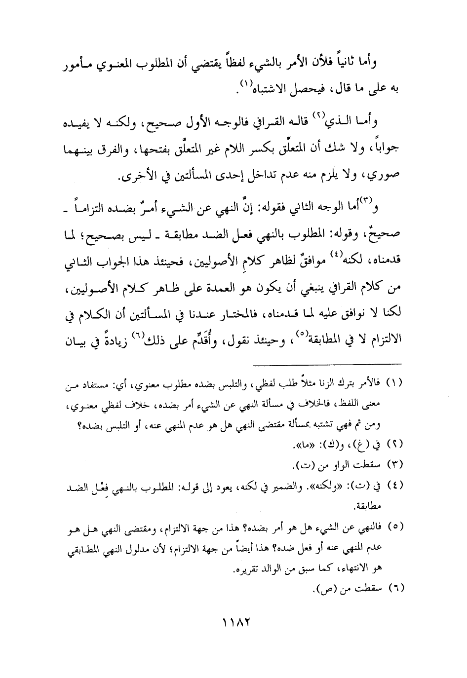 و(¬٣) أما الوجه الثاني فقوله: إنَّ النهي عن الشيء أمرٌ بضده التزامًا - صحيحٌ، وقوله: المطلوب بالنهي فعل الضد مطابقة - ليس بصحيح؛ لما قدمناه، لكنه (¬٤) موافقٌ لظاهر كلامِ الأصوليين، فحينئذ هذا الجواب الثاني من كلام القرافي ينبغي أن يكون هو العمدة على ظاهر كلام الأصوليين، لكنا لا نوافق عليه لما قدمناه، فالمختار عندنا في المسألتين أن الكلام في الالتزام لا في المطابقة (¬٥)، وحينئذ نقول، وأُقَدِّم على ذلك (¬٦) زيادةً في بيان