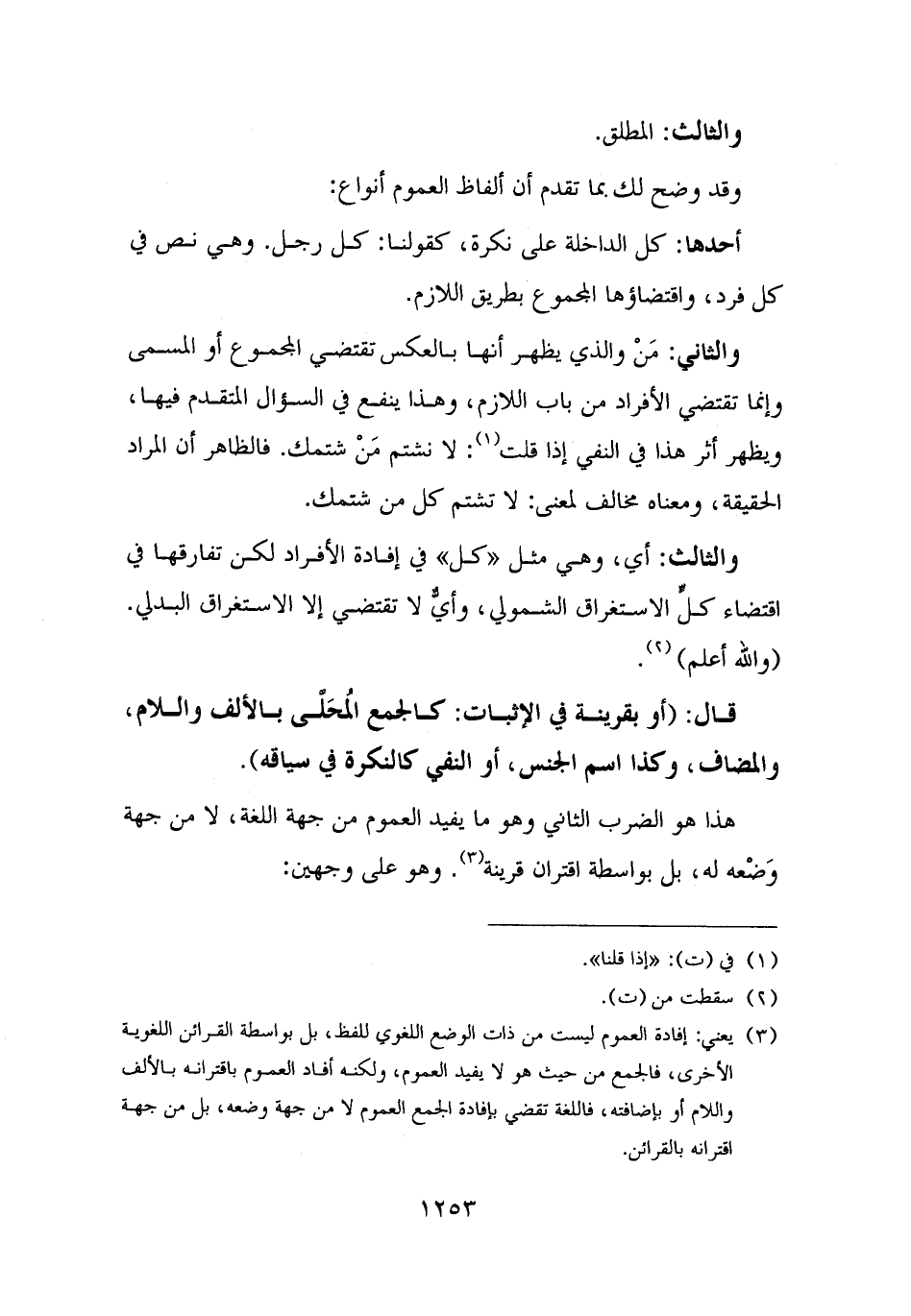 (¬٣) يعني: إفادة العموم ليست من ذات الوضع اللغوي للفظ، بل بواسطة القرائن اللغوية الأخرى، فالجمع من حيث هو لا يفيد العموم، ولكنه أفاد العموم باقترانه بالألف واللام أو بإضافته، فاللغة تقضي بإفادة الجمع العموم لا من جهة وضعه، بل من جهة اقترانه بالقرائن.