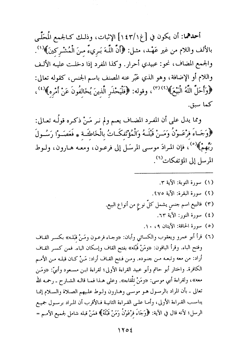 أحدهما: أن يكون في الإثبات، وذلك كالجمع المُحَلَّى بالألف واللام من غير عَهْد، مثل: {أَنَّ اللَّهَ بَرِيءٌ مِنَ الْمُشْرِكِينَ} (¬١). والجمع المضاف، نحو: عبيدي أحرار. وكذا المفرد إذا دخلت عليه الألف واللام أو الإضافة، وهو الذي عبر عنه المصنف باسم الجنس، كقوله تعالى: {وَأَحَلَّ اللَّهُ الْبَيْعَ} (¬٢) (¬٣)، وقوله: {فَلْيَحْذَرِ الَّذِينَ يُخَالِفُونَ عَنْ أَمْرِهِ} (¬٤)، كما سبق.