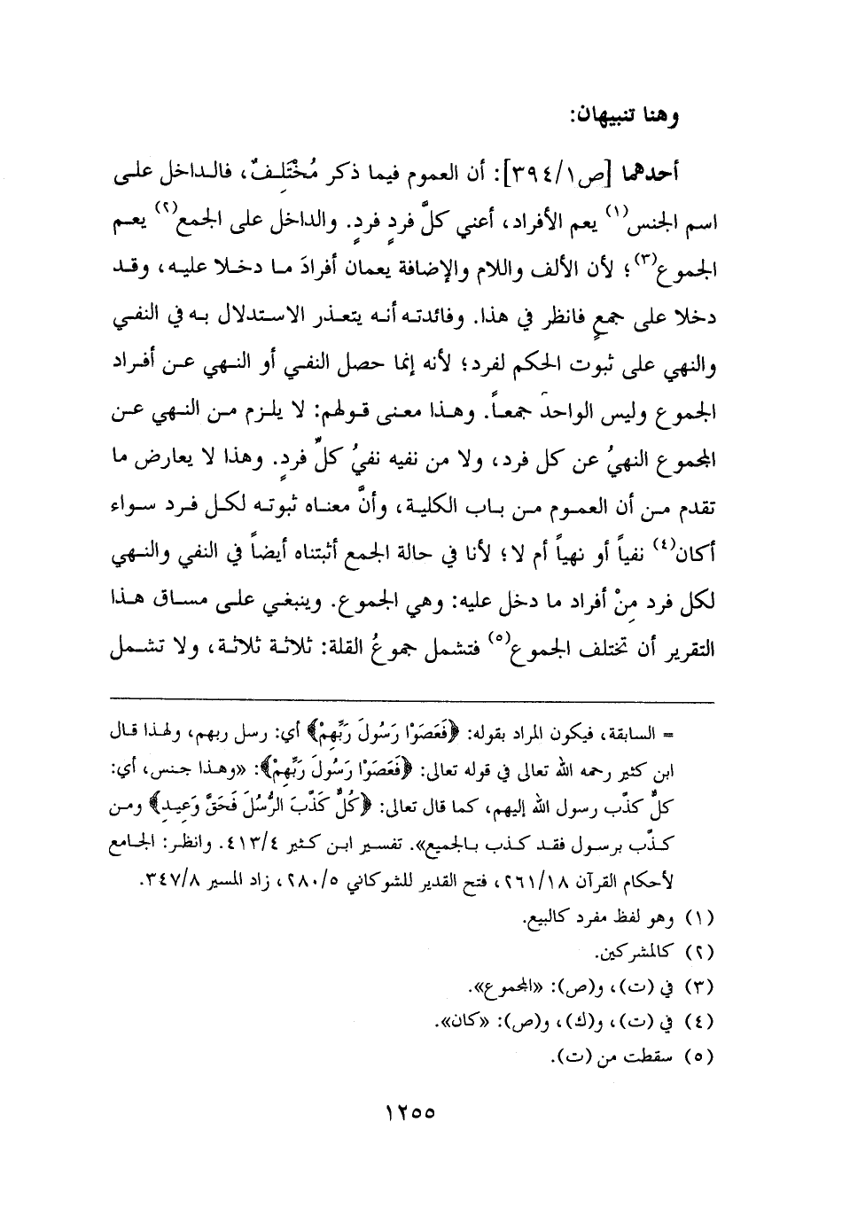 أحدهما: أن العموم فيما ذكر مُخْتَلِفٌ، فالداخل على اسم الجنس (¬١) يعم الأفراد، أعني كلَّ فردٍ فردٍ. والداخل على الجمع (¬٢) يعم الجموع (¬٣)؛ لأن الألف واللام والإضافة يعمان أفرادَ ما دخلا عليه، وقد دخلا على جمعٍ فانظر في هذا. وفائدته أنه يتعذر الاستدلال به في النفي والنهي على ثبوت الحكم لفرد؛ لأنه إنما حصل النفي أو النهي عن أفراد الجموع وليس الواحد جمعًا. وهذا معنى قولهم: لا يلزم من النهي عن المجموع النهيُ عن كل فرد، ولا من نفيه نفيُ كلِّ فردٍ. وهذا لا يعارض ما تقدم من أن العموم من باب الكلية، وأنَّ معناه ثبوته لكل فرد سواء أكان (¬٤) نفيًا أو نهيًا أم لا؛ لأنا في حالة الجمع أثبتناه أيضًا في النفي والنهي لكل فرد مِنْ أفراد ما دخل عليه: وهي الجموع. وينبغي على مساق هذا التقرير أن تختلف الجموع (¬٥) فتشمل جموعُ القلة: ثلاثة ثلاثة، ولا تشمل