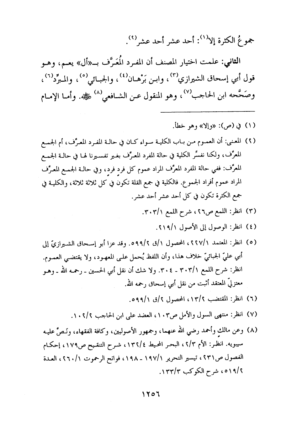 (¬٢) المعنى: أن العموم من باب الكلية سواء كان في حالة الفرد المعرَّف؛ أم الجمع المعرَّف، ولكنا نفسِّر الكلية في حالة المفرد المعرَّف بغير تفسيرنا لها في حالة الجمع المعرَّف: ففي حالة المفرد المعرَّف المراد عموم كل فردٍ فردٍ، وفي حالة الجمع المعرَّف المراد عموم أفراد الجموع. فالكلية في جمع القلة تكون في كل ثلاثة ثلاثة، والكلية في جمع الكثرة تكون في كل أحد عشر أحد عشر.