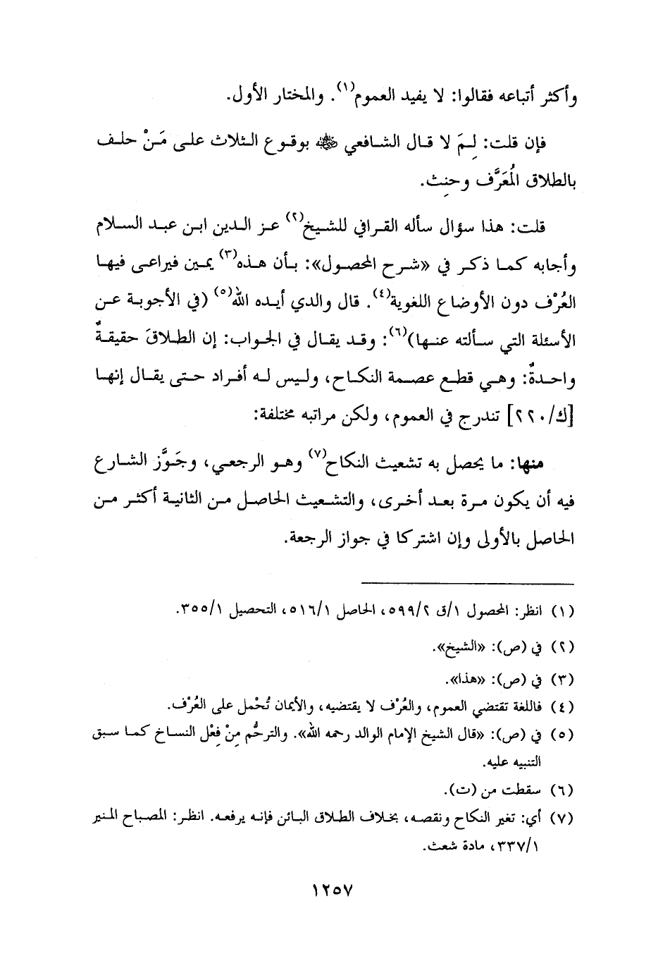 قلت: هذا سؤال سأله القرافي للشيخ (¬٢) عز الدين بن عبد السلام وأجابه كما ذكر في "شرح المحصول": بأن هذه (¬٣) يمين فيراعى فيها العُرْف دون الأوضاع اللغوية (¬٤). قال والدي أيده الله (¬٥) (في الأجوبة عن الأسئلة التي سألته عنها) (¬٦): وقد يقال في الجواب: إن الطلاقَ حقيقةٌ واحدةٌ: وهي قطع عصمة النكاح، وليس له أفراد حتى يقال إنها تندرج في العموم، ولكن مراتبه مختلفة: