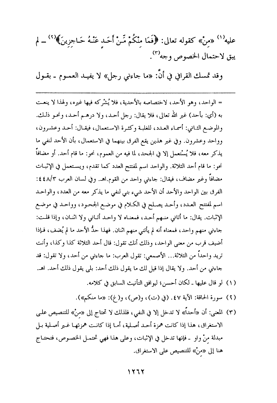 (¬٣) المعنى: أن "أحدًا" لا تدخل إلا في النفي، فلذلك لا تحتاج إلى "مِنْ" للتنصيص على الاستغراق، هذا إذا كانت همزة أحد أصلية، أما إذا كانت همزتها غير أصلية بل مبدلة مِنْ واو - فإنها تدخل في الإثبات، وعلى هذا فهي تحتمل الخصوص، فتحتاج هنا إلى "مِنْ" للتنصيص على الاستغراق.