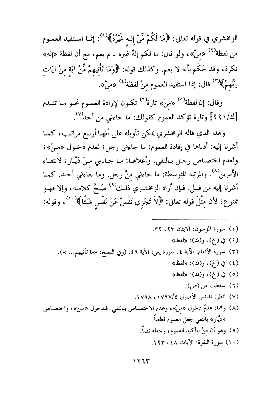 الزمخشري في قوله تعالى: {مَا لَكُمْ مِنْ إِلَهٍ غَيْرُهُ} (¬١): إنما استفيد العموم من لفظة (¬٢) "مِنْ"، ولو قال: ما لكم إلهٌ غيره - لم يعم، مع أن لفظة "إله" نكرة، وقد حَكَم بأنه لا يعم. وكذلك قوله: {وَمَا تَأْتِيهِمْ مِنْ آيَةٍ مِنْ آيَاتِ رَبِّهِمْ} (¬٣) قال: إنما استفيد العموم مِنْ لفظة (¬٤) "مِنْ".