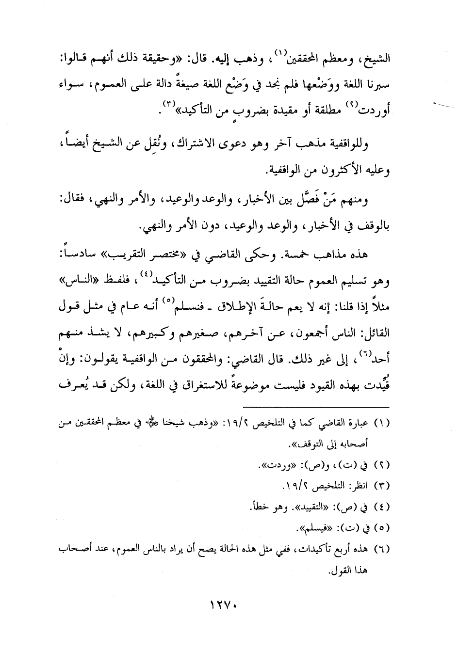 هذه مذاهب خمسة. وحكى القاضي في "مختصر التقريب" سادسًا: وهو تسليم العموم حالة التقييد بضروب من التأكيد (¬٤)، فلفظ "الناس" مثلًا إذا قلنا: إنه لا يعم حالةَ الإطلاق - فنسلم (¬٥) أنه عام في مثل قول القائل: الناس أجمعون، عن آخرهم، صغيرهم وكبيرهم، لا يشذ منهم أحد (¬٦)، إلى غير ذلك. قال القاضي: والمحققون من الواقفية يقولون: وإنْ قُيِّدت بهذه القيود فليست موضوعةً للاستغراق في اللغة، ولكن قد يُعرف