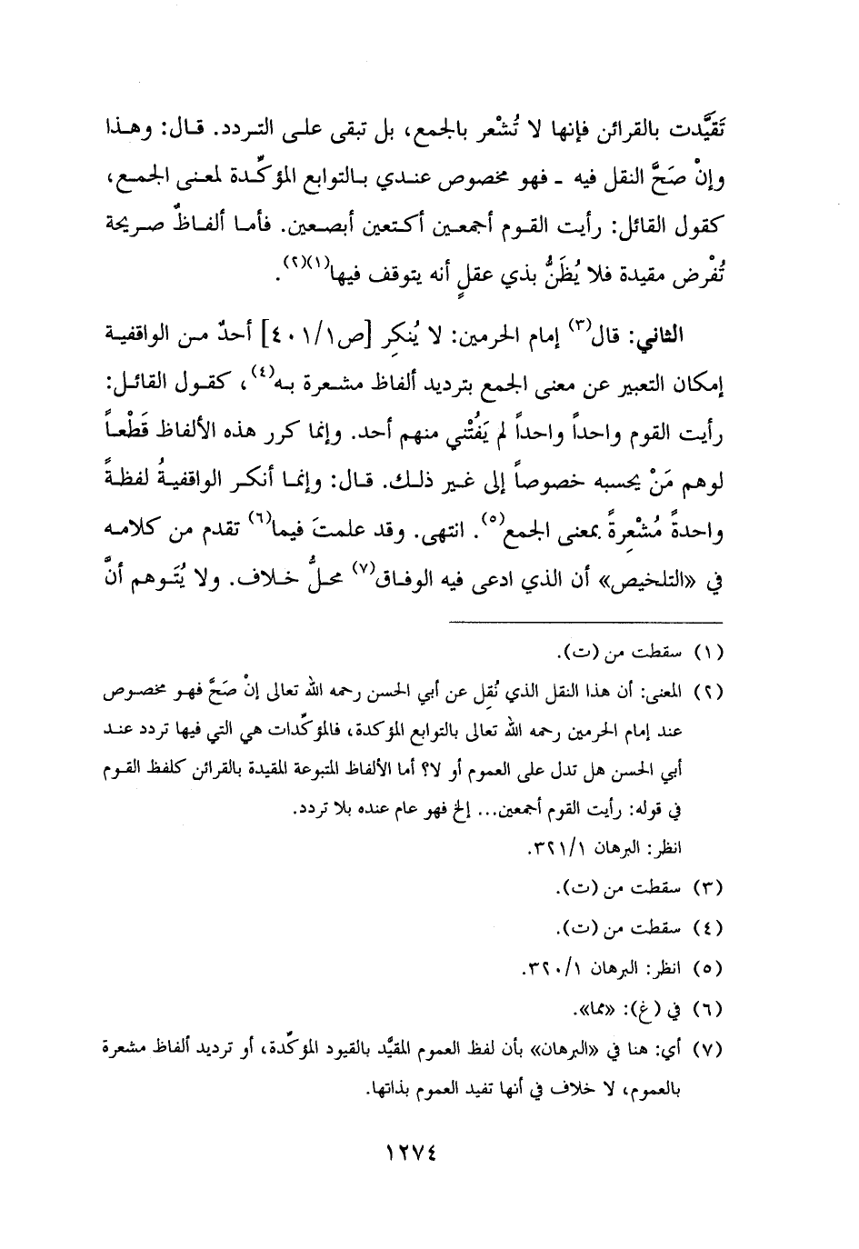 (¬٢) المعنى: أن هذا النقل الذي نُقِل عن أبي الحسن رحمه الله تعالى إنْ صَحَّ فهو مخصوص عند إمام الحرمين رحمه الله تعالى بالتوابع المؤكدة، فالمؤكِّدات هي التي فيها تردد عند أبي الحسن هل تدل على العموم أو لا؟ أما الألفاظ المتبوعة المقيدة بالقرائن كلفظ القوم في قوله: رأيت القوم أجمعين. . . إلخ فهو عام عنده بلا تردد.