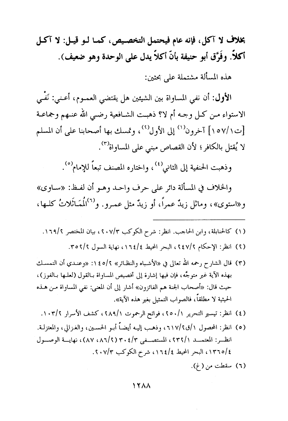الأول: أن نفي المساواة بين الشيئين هل يقتضي العموم، أعنى: نَفْي الاستواء من كل وجه أم لا؟ ذهبت الشافعية رضي الله عنهم وجماعة آخرون (¬١) إلى الأول (¬٢)، وتمسك بها أصحابنا على أن المسلم لا يُقتل بالكافر؛ لأن القصاص مبني على المساواة (¬٣).