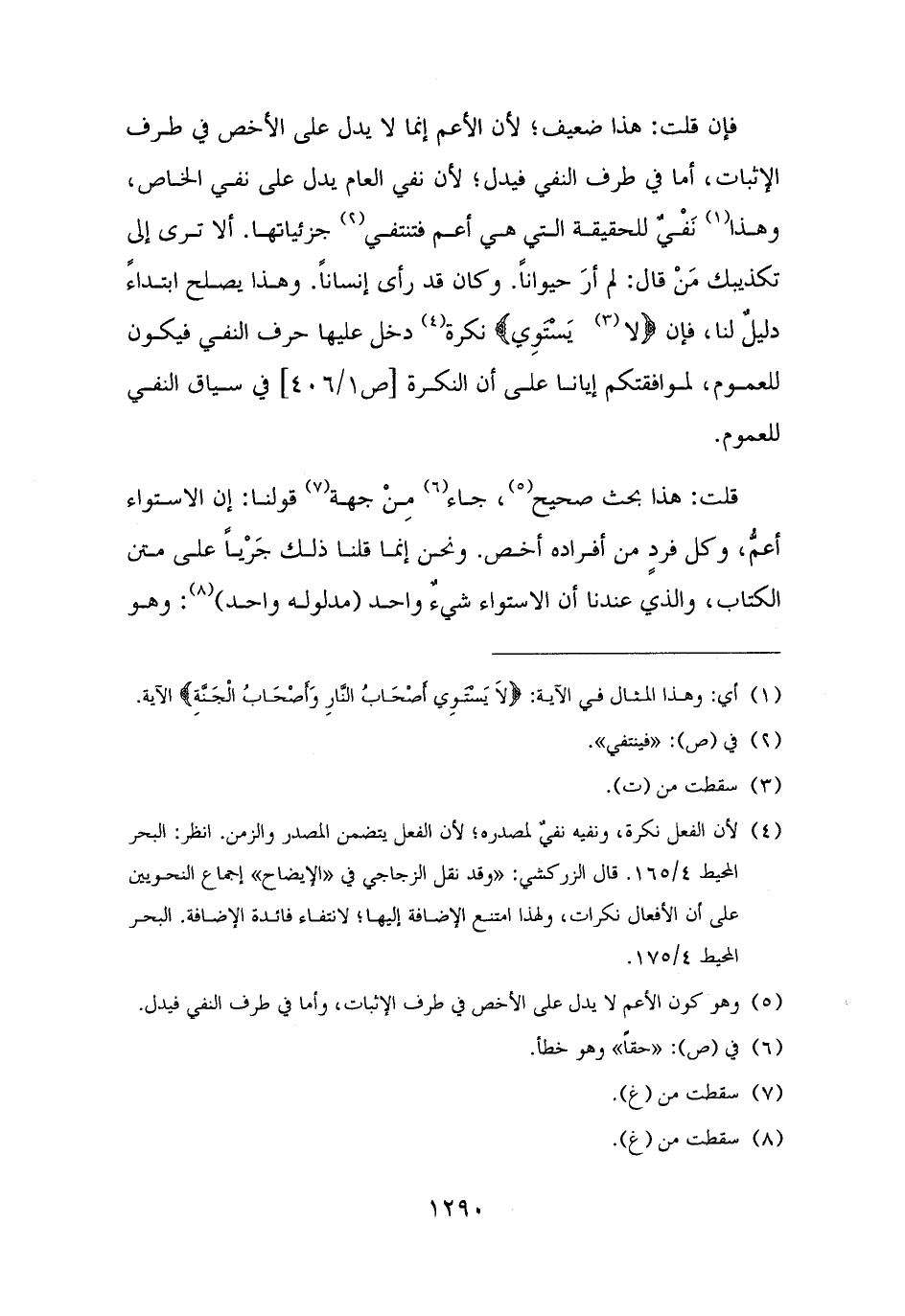 فإن قلت: هذا ضعيف؛ لأن الأعم إنما لا يدل على الأخص في طرف الإثبات، أما في طرف النفي فيدل؛ لأن نفي العام يدل على نفي الخاص، وهذا (¬١) نَفْيٌ للحقيقة التي هي أعم فتنتفي (¬٢) جزئياتها. ألا ترى إلى تكذيبك مَنْ قال: لم أرَ حيوانًا. وكان قد رأى إنسانًا. وهذا يصلح ابتداءً دليلٌ لنا، فإن {لَا (¬٣) يَسْتَوِي} نكرة (¬٤) دخل عليها حرف النفي فيكون للعموم، لموافقتكم إيانا على أن النكرة في سياق النفي للعموم.