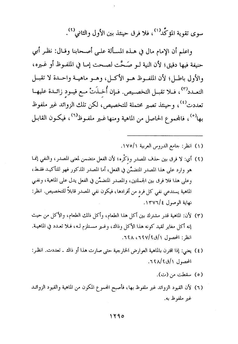 (¬٢) أي: لا فرق بين حذف المصدر وذِكْره؛ لأن الفعل متضمن لمعنى المصدر، والنفي إنما هو وارد على هذا المصدر المتضمَّن في الفعل، أما المصدر المذكور فهو للتأكيد فقط، وعلى هذا فلا فرق بين الجملتين، والمصدر المتضمَّن في الفعل يدل على الماهية، ونفي الماهية يستدعي نفي كل فردٍ من أفرادها، فيكون نفي المصدر قابلًا للتخصيص. انظر: نهاية الوصول ٤/ ١٣٧٦.