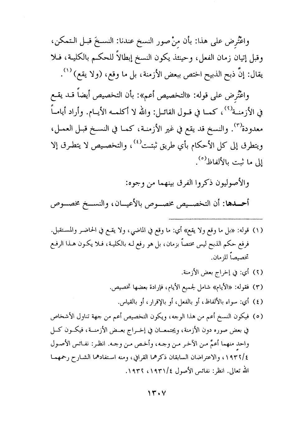 (¬٥) فيكون النسخ أعم من هذا الوجه، ويكون التخصيص أعم من جهة تناول الأشخاص في بعض صوره دون الأزمنة، ويجتمعان في إخراج بعض الأزمنة، فيكون كل واحدٍ منهما أعمَّ من الآخر من وجه، وأخص من وجه. انظر: نفائس الأصول ٤/ ١٩٣٢، والاعتراضان السابقان ذكرهما القرافي، ومنه استفادهما الشارح رحمهما الله تعالى. انظر: نفائس الأصول ٤/ ١٩٣١، ١٩٣٢.