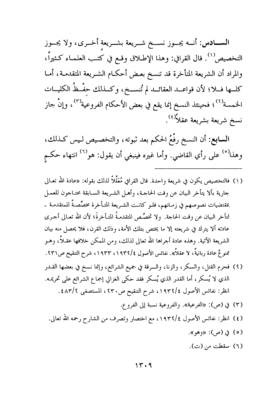 السادس: أنه يجوز نسخ شريعة بشريعةٍ أخرى، ولا يجوز التخصيص (¬١). قال القرافي: وهذا الإطلاق وقع في كتب العلماء كثيرًا، والمراد أن الشريعة المتأخرة قد تنسخ بعض أحكام الشريعة المتقدمة، أما كلها فلا؛ لأن قواعد العقائد لم تُنسخ، وكذلك حِفْظُ الكليات الخمسة (¬٢)؛ فحينئذ النسخ إنما يقع في بعض الأحكام الفروعية (¬٣)، وإنْ جاز نسخ شريعة بشريعة عقلًا (¬٤).