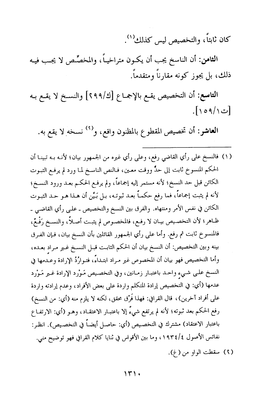 (¬١) فالنسخ على رأي القاضي رفع، وعلى رأي غيره من الجمهور بيان؛ لأنه به تبينا أن الحكم المنسوخ ثابت إلى حدٍّ ووقت معين، فالنص الناسخ لما ورد لم يرفع الثبوت الكائن قبل حد النسخ؛ لأنه مستمر إليه إجماعًا، ولم يرفع الحكم بعد ورود النسخ؛ لأنه لم يثبت إجماعًا، فما رفع حكمًا بعد ثبوته، بل بَيَّن أن هذا هو حد الثبوت الكائن في نفس الأمر ومنتهاه. والفرق بين النسخ والتخصيص - على رأي القاضي - ظاهر؛ لأن التخصيص بيان لا رفع، فالمخصوص لم يثبت أصلًا، والنسخ رَفْعٌ، فالمنسوخ ثابت ثم رفع. وأما على رأي الجمهور القائلين بأن النسخ بيان، فإن الفرق بينه وبين التخصيص: أن النسخ بيان أن الحكم الثابت قبل النسخ غير مرادٍ بعده، وأما التخصيص فهو بيان أن المخصوص غير مراد ابتداءً، فتوارُدُ الإرادة وعدمها في النسخ على شيء واحد باعتبار زمانين، وفي التخصيص مَوْرد الإرادة غير مَوْرد عدمها (أي: في التخصيص إرادة المتكلم واردة على بعض الأفراد، وعدم إرادته واردة على أفراد آخرين)، قال القرافي: فهذا فَرْق محقق، لكنه لا يلزم منه (أي: من النسخ) رفع الحكم بعد ثبوته؛ لأنه لم يرتفع شيءٌ إلا باعتبار الاعتقاد، وهو (أي: الارتفاع باعتبار الاعتماد) مشترك في التخصيص (أي: حاصل أيضًا في التخصيص). انظر: نفائس الأصول ٤/ ١٩٣٤، وما بين الأقواس في ثنايا كلام القرافي فهو توضيح منى.