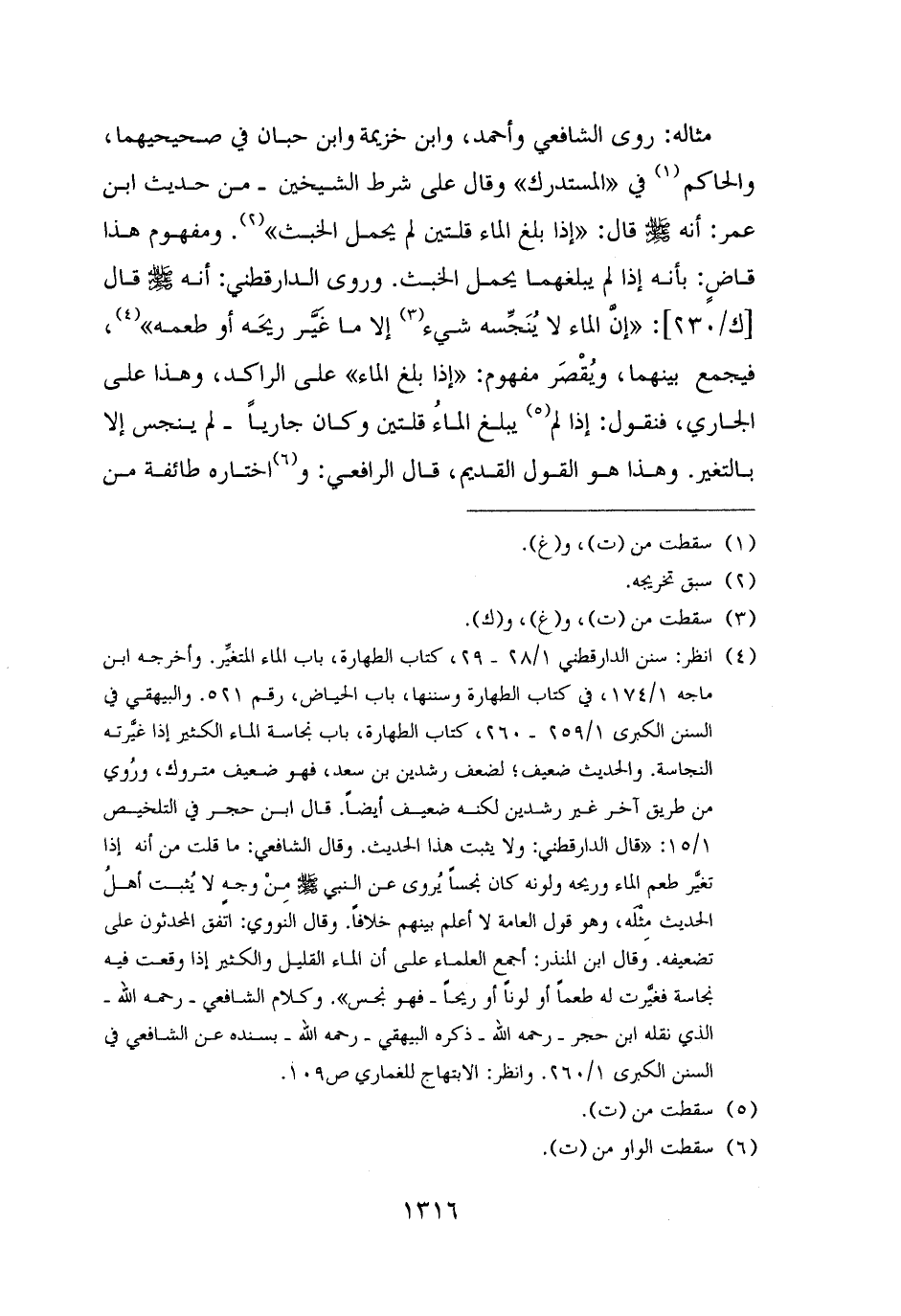 (¬٤) انظر: سنن الدارقطني ١/ ٢٨ - ٢٩، كتاب الطهارة، باب الماء المتغيِّر. وأخرجه ابن ماجه ١/ ١٧٤، في كتاب الطهارة وسننها، باب الحياض، رقم ٥٢١. والبيهقي في السنن الكبرى ١/ ٢٥٩ - ٢٦٠، كتاب الطهارة، باب نجاسة الماء الكثير إذا غيَّرته النجاسة. والحديث ضعيف؛ لضعف رشدين بن سعد، فهو ضعيف متروك، ورُوي من طريق آخر غير رشدين لكنه ضعيف أيضًا. قال ابن حجر في التلخيص ١/ ١٥: "قال الدارقطني: ولا يثبت هذا الحديث. وقال الشافعي: ما قلت من أنه إذا تغيَّر طعم الماء وريحه ولونه كان نجسًا يُروى عن النبي - صلى الله عليه وسلم - منْ وجهٍ لا يُثبت أهلُ الحديث مِثْلَه، وهو قول العامة لا أعلم بينهم خلافًا. وقال النووي: اتفق المحدثون على تضعيفه. وقال ابن المنذر: أجمع العلماء على أن الماء القليل والكثير إذا وقعت فيه نجاسة فغيرت له طعمًا أو لونًا أو ريحًا - فهو نجس". وكلام الشافعي - رحمه الله - الذي نقله ابن حجر - رحمه الله - ذكره البيهقي - رحمه الله - بسنده عن الشافعي في السنن الكبرى ١/ ٢٦٠. وانظر: الابتهاج للغماري ص ١٠٩.
