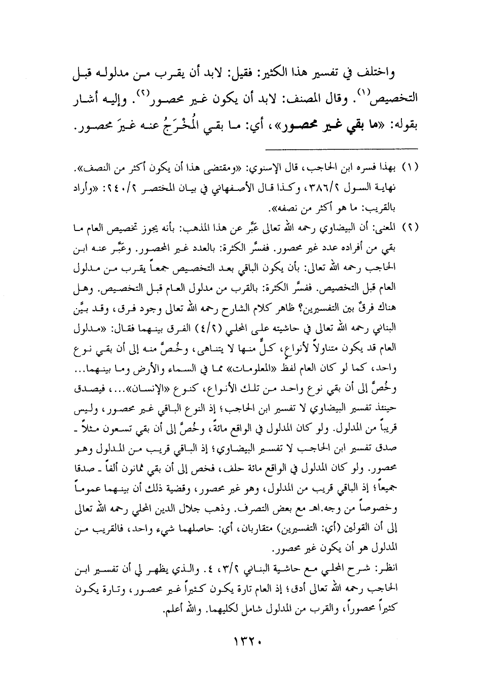 (¬٢) المعنى: أن البيضاوي رحمه الله تعالى عَبَّر عن هذا المذهب: بأنه يجوز تخصيص العام ما بقي من أفراده عدد غير محصور. ففسَّر الكثرة: بالعدد غير المحصور. وعَبَّر عنه ابن الحاجب رحمه الله تعالى: بأن يكون الباقي بعد التخصيص جمعًا يقرب من مدلول العام قبل التخصيص. ففسَّر الكثرة: بالقرب من مدلول العام قبل التخصيص. وهل هناك فرقٌ بين التفسيرين؟ ظاهر كلام الشارح رحمه الله تعالى وجود فرق، وقد بيَّن البناني رحمه الله تعالى في حاشيته على المحلي (٢/ ٤) الفرق بينهما فقال: "مدلول العام قد يكون متناولًا لأنواعٍ، كلٌّ منها لا يتناهى، وخُصَّ منه إلى أن بقي نوع واحد، كما لو كان العام لفظ "المعلومات" مما في السماء والأرض وما بينهما. . . وخُصَّ إلى أن بقي نوع واحد من تلك الأنواع، كنوع "الإنسان". . .، فيصدق حينئذ تفسير البيضاوي لا تفسير ابن الحاجب؛ إذ النوع الباقي غير محصور، وليس قريبًا من المدلول. ولو كان المدلول في الواقع مائةً، وخُصَّ إلى أن بقي تسعون مثلًا - صدق تفسير ابن الحاجب لا تفسير البيضاوي؛ إذ الباقي قريب من المدلول وهو محصور. ولو كان المدلول في الواقع مائة حلف، فخص إلى أن بقي ثمانون ألفًا - صدقا جميعًا؛ إذ الباقي قريب من المدلول، وهو غير محصور، وقضية ذلك أن بينهما عمومًا وخصوصًا من وجه. اهـ مع بعض التصرف. وذهب جلال الدين المحلي رحمه الله تعالى إلى أن القولين (أي: التفسيرين) متقاربان، أي: حاصلهما شيء واحد، فالقريب من المدلول هو أن يكون غير محصور.