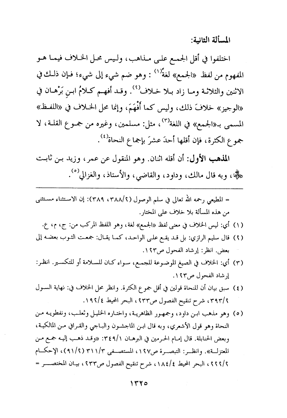 (¬٤) سبق بيان أن للنحاة قولين في أقل جموع الكثرة. وانظر محل الخلاف في: نهاية السول ٢/ ٣٩٣، شرح تنقيح الفصول ص ٢٣٣، البحر المحيط ٤/ ١٩٢.