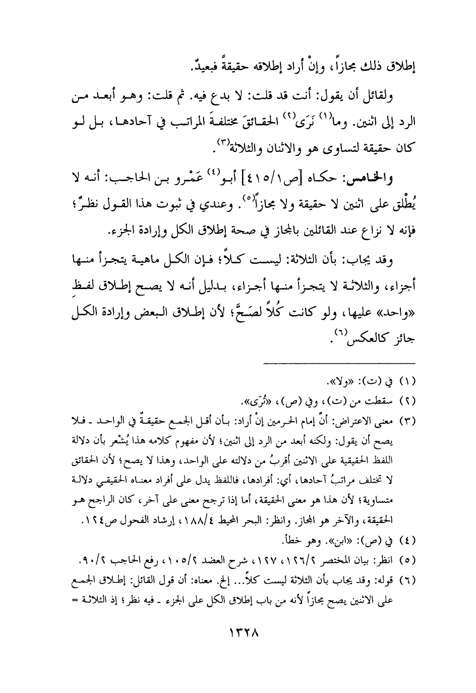 (¬٣) معنى الاعتراض: أنَّ إمام الحرمين إنْ أراد: بأن أقل الجمع حقيقةٌ في الواحد - فلا يصح أن يقول: ولكنه أبعد من الرد إلى اثنين؛ لأن مفهوم كلامه هذا يُشْعر بأن دلالة اللفظ الحقيقية على الاثنين أقربُ من دلالته على الواحد، وهذا لا يصح؛ لأن الحقائق لا تختلف مراتبُ آحادها، أي: أفرادها، فاللفظ يدل على أفراد معناه الحقيقي دلالة متساوية؛ لأن هذا هو معنى الحقيقة، أما إذا ترجح معنى على آخر، كان الراجح هو الحقيقة، والآخر هو المجاز. وانظر: البحر المحيط ٤/ ١٨٨، إرشاد الفحول ص ١٢٤.