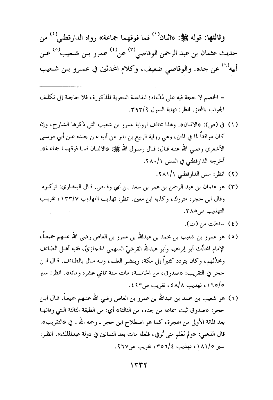وثالثها: قوله - صلى الله عليه وسلم -: "اثنان (¬١) فما فوقهما جماعة" رواه الدارقطني (¬٢) من حديث عثمان بن عبد الرحمن الوقاصي (¬٣) عن (¬٤) عمرو بن شعيب (¬٥) عن أبيه (¬٦) عن جده. والوقاصي ضعيف، وكلام المحدثين في عمرو بن شعيب