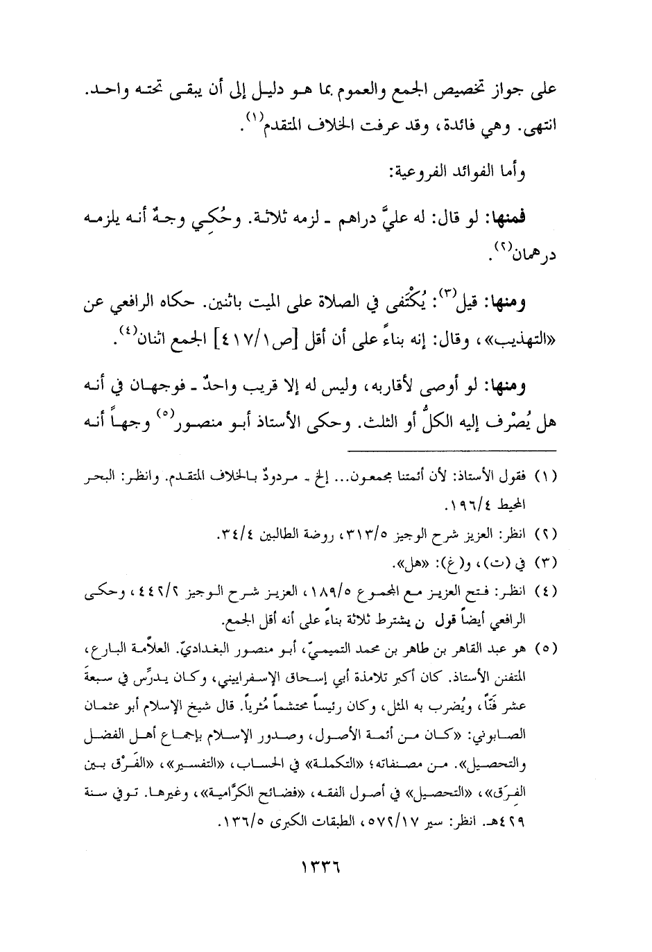 (¬٥) هو عبد القاهر بن طاهر بن محمد التميميّ، أبو منصور البغداديّ. العلّامة البارع، المتفنن الأستاذ. كان أكبر تلامذة أبي إسحاق الإسفراييني، وكان يدرِّس في سبعةَ عشر فَنًّا، ويُضرب به المثل، وكان رئيسًا محتشمًا مُثريًا. قال شيخ الإسلام أبو عثمان الصابوني: "كان من أئمة الأصول، وصدور الإسلام بإجماع أهل الفضل والتحصيل". من مصنفاته؛ "التكملة" في الحساب، "التفسير"، "الفَرْق بين الفِرَق"، "التحصيل" في أصول الفقه، "فضائح الكرَّامية"، وغيرها. توفي سنة ٤٢٩ هـ. انظر: سير ١٧/ ٥٧٢، الطبقات الكبرى ٥/ ١٣٦.