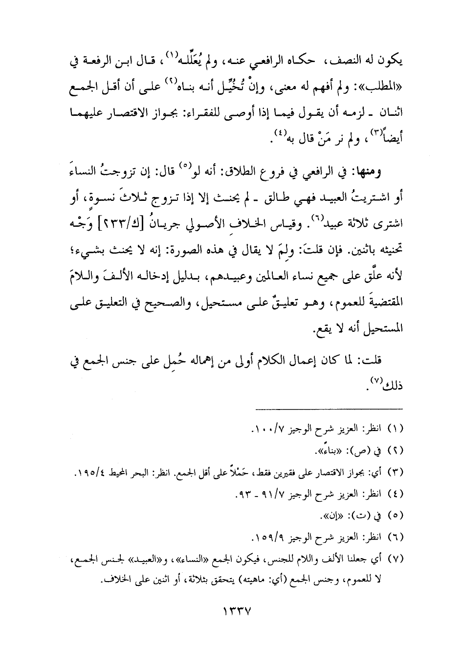 (¬٧) أي جعلنا الألف واللام للجنس، فيكون الجمع "النساء"، و"العبيد" لجنس الجمع، لا للعموم، وجنس الجمع (أي: ماهيته) يتحقق بثلاثة، أو اثنين على الخلاف.