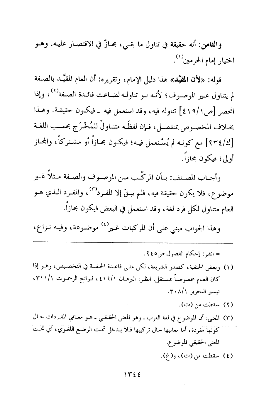 وأجاب المصنف: بأن المركَّب من الموصوف والصفة مثلًا غير موضوع، فلا يكون حقيقة فيه، فلم يبقَ إلا المفرد (¬٣)، والمفرد الذي هو العام متناول لكل فرد لغة، وقد استعمل في البعض فيكون مجازًا.