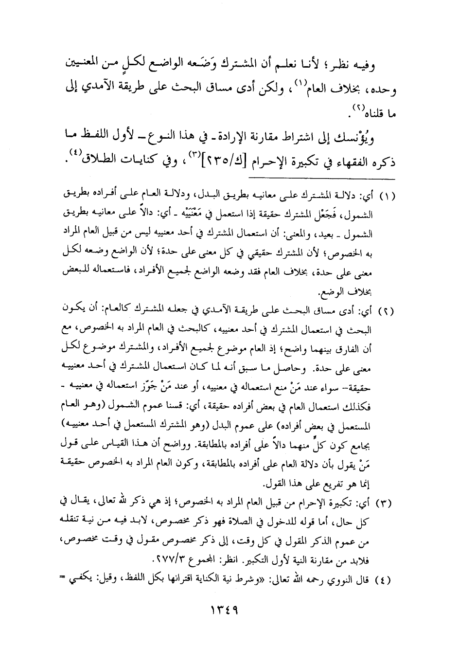 وفيه نظر؛ لأنا نعلم أن المشترك وَضَعه الواضع لكلٍ من المعنيين وحده، بخلاف العام (¬١)، ولكن أدى مساق البحث على طريقة الآمدي إلى ما قلناه (¬٢).