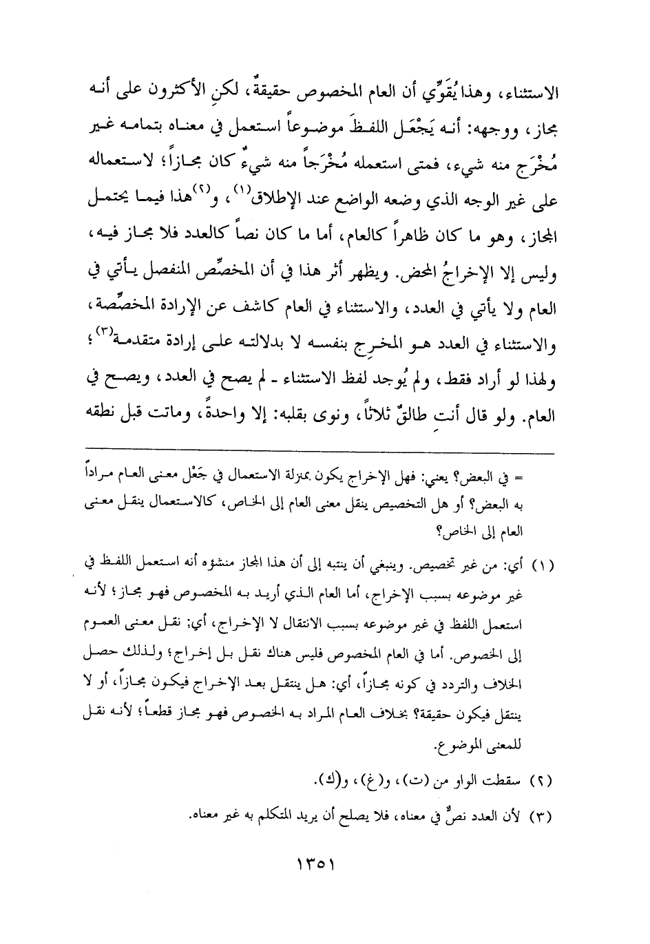 (¬١) أي: من غير تخصيص. وينبغي أن ينتبه إلى أن هذا المجاز منشؤه أنه استعمل اللفظ في غير موضوعه بسبب الإخراج، أما العام الذي أريد به المخصوص فهو مجاز؛ لأنه استعمل اللفظ في غير موضوعه بسبب الانتقال لا الإخراج، أي: نقل معنى العموم إلى الخصوص. أما في العام المخصوص فليس هناك نقل بل إخراج؛ ولذلك حصل الخلاف والتردد في كونه مجازًا، أي: هل ينتقل بعد الإخراج فيكون مجازًا، أو لا ينتقل فيكون حقيقة؟ بخلاف العام المراد به الخصوص فهو مجاز قطعًا؛ لأنه نقل للمعنى الموضوع.
