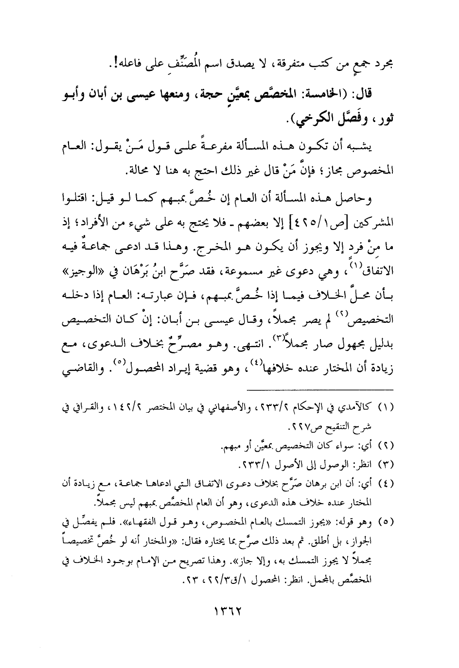 (¬٥) وهو قوله: "يجوز التمسك بالعام المخصوص، وهو قول الفقهاء". فلم يفصِّل في الجواز، بل أطلق. ثم بعد ذلك صرَّح بما يختاره فقال: "والمختار أنه لو خُصَّ تخصيصًا مجملًا لا يجوز التمسك به، وإلا جاز". وهذا تصريح من الإمام بوجود الخلاف في المخصَّص بالمجمل. انظر: المحصول ١/ ق ٣/ ٢٢، ٢٣.
