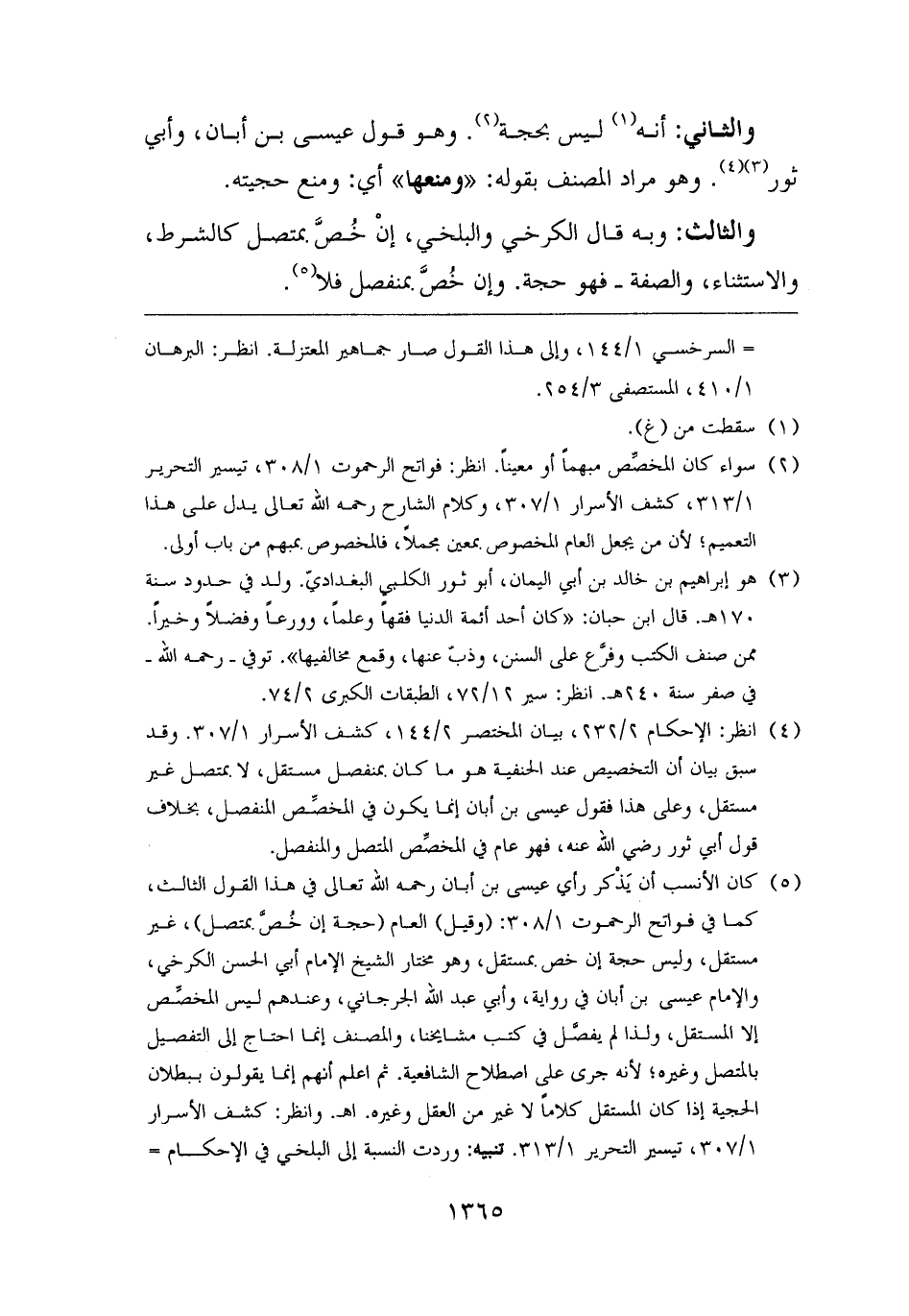 (¬٤) انظر: الإحكام ٢/ ٢٣٢، بيان المختصر ٢/ ١٤٤، كشف الأسرار ١/ ٣٠٧. وقد سبق بيان أن التخصيص عند الحنفية هو ما كان بمنفصل مستقل، لا بمتصل غير مستقل، وعلى هذا فقول عيسى بن أبان إنما يكون في المخصِّص المنفصل، بخلاف قول أبي ثور رضي الله عنه، فهو عام في المخصِّص المتصل والمنفصل.