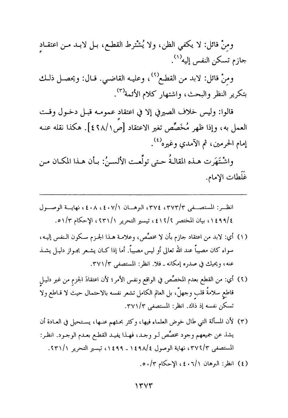 ومِنْ قائل: لا بد من القطع (¬٢)، وعليه القاضي. قال: ويحصل ذلك بتكرير النظر والبحث، واشتهار كلام الأئمة (¬٣).