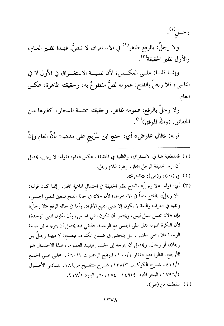 ولا رجلٌ: بالرفع ظاهر (¬٢) في الاستغراق لا نصٌّ. فهذا نظير العام، والأول نظير الحقيقة (¬٣).