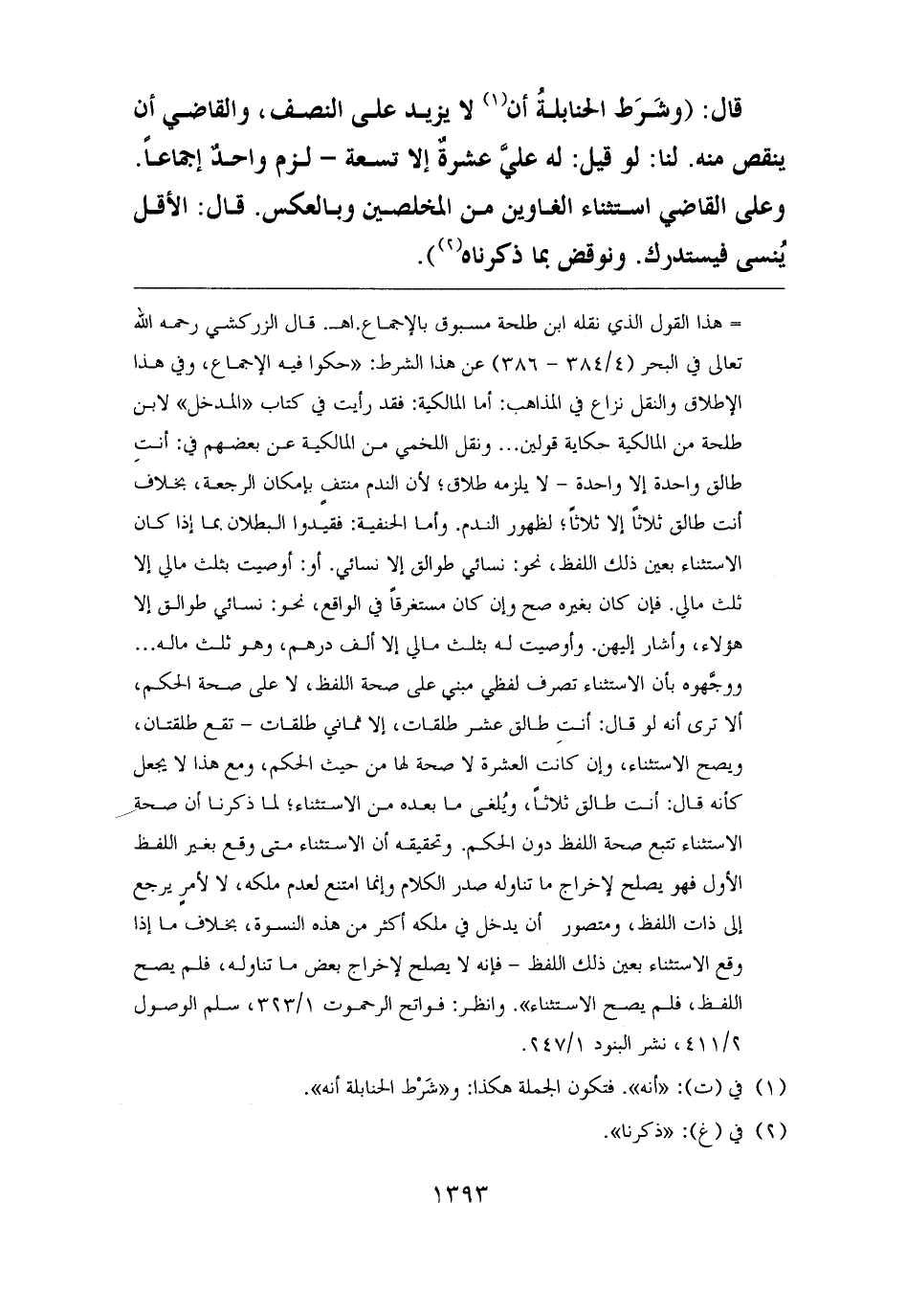 = هذا القول الذي نقله ابن طلحة مسبوق بالإجماع. اهـ. قال الزركشي رحمه الله تعالى في البحر (٤/ ٣٨٤ - ٣٨٦) عن هذا الشرط: "حكوا فيه الإجماع، وفي هذا الإطلاق والنقل نزاع في المذاهب: أما المالكية: فقد رأيت في كتاب "المدخل" لابن طلحة من المالكية حكاية قولين. . . ونقل اللخمي من المالكية عن بعضهم في: أنتِ طالق واحدة إلا واحدة - لا يلزمه طلاق؛ لأن الندم منتفٍ بإمكان الرجعة، بخلاف أنت طالق ثلاثًا إلا ثلاثًا؛ لظهور الندم. وأما الحنفية: فقيدوا البطلان بما إذا كان الاستثناء بعين ذلك اللفظ، نحو: نسائي طوالق إلا نسائي. أو: أوصيت بثلث مالي إلا ثلث مالي. فإن كان بغيره صح وإن كان مستغرقًا في الواقع، نحو: نسائي طوالق إلا هؤلاء، وأشار إليهن. وأوصيت له بثلث مالي إلا ألف درهم، وهو ثلث ماله. . . ووجَّهوه بأن الاستثناء تصرف لفظي مبني على صحة اللفظ، لا على صحة الحكم، ألا ترى أنه لو قال: أنتِ طالق عشر طلقات، إلا ثماني طلقات - تقع طلقتان، ويصح الاستثناء، وإن كانت العشرة لا صحة لها من حيث الحكم، ومع هذا لا يجعل كأنه قال: أنت طالق ثلاثًا، ويُلغى ما بعده من الاستثناء؛ لما ذكرنا أن صحة الاستثناء تتبع صحة اللفظ دون الحكم. وتحقيقه أن الاستثناء متى وقع بغير اللفظ الأول فهو يصلح لإخراج ما تناوله صدر الكلام وإنما امتنع لعدم ملكه، لا لأمرٍ يرجع إلى ذات اللفظ، ومتصور أن يدخل في ملكه أكثر من هذه النسوة، بخلاف ما إذا وقع الاستثناء بعين ذلك اللفظ - فإنه لا يصلح لإخراج بعض ما تناوله، فلم يصح اللفظ، فلم يصح الاستثناء". وانظر: فواتح الرحموت ١/ ٣٢٣، سلم الوصول ٢/ ٤١١، نشر البنود ١/ ٢٤٧.