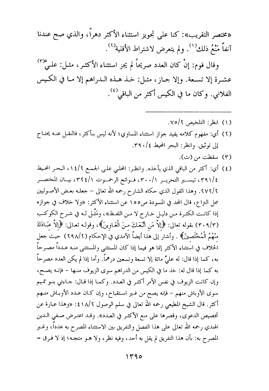 (¬٢) أي: مفهوم كلامه يفيد جواز استثناء المساوي؛ لأنه ليس بأكثر، فالنقل عنه يحتاج إلى توثيق. وانظر: البحر المحيط ٤/ ٣٩٠.