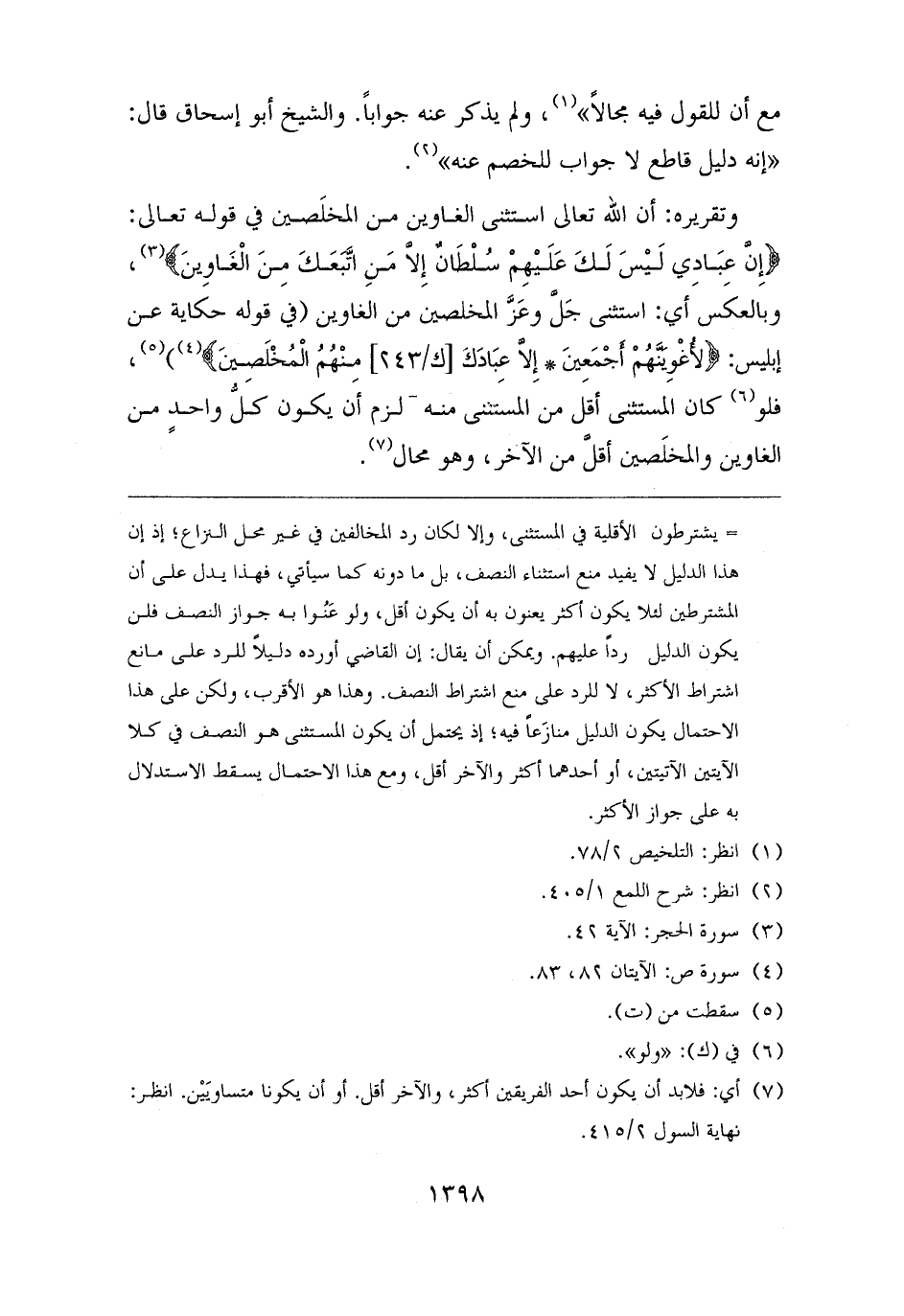 وتقريره: أن الله تعالى استثنى الغاوين من المخلَصين في قوله تعالى: {إِنَّ عِبَادِي لَيْسَ لَكَ عَلَيْهِمْ سُلْطَانٌ إِلَّا مَنِ اتَّبَعَكَ مِنَ الْغَاوِينَ} (¬٣)، وبالعكس أي: استثنى جَلَّ وعَزَّ المخلصين من الغاوين (في قوله حكاية عن إبليس: {لَأُغْوِيَنَّهُمْ أَجْمَعِينَ (٨٢) إِلَّا عِبَادَكَ مِنْهُمُ الْمُخْلَصِينَ} (¬٤)) (¬٥)، فلو (¬٦) كان المستثنى أقل من المستثنى منه لزم أن يكون كلُّ واحدٍ من الغاوين والمخلَصين أقلَّ من الآخر، وهو محال (¬٧).