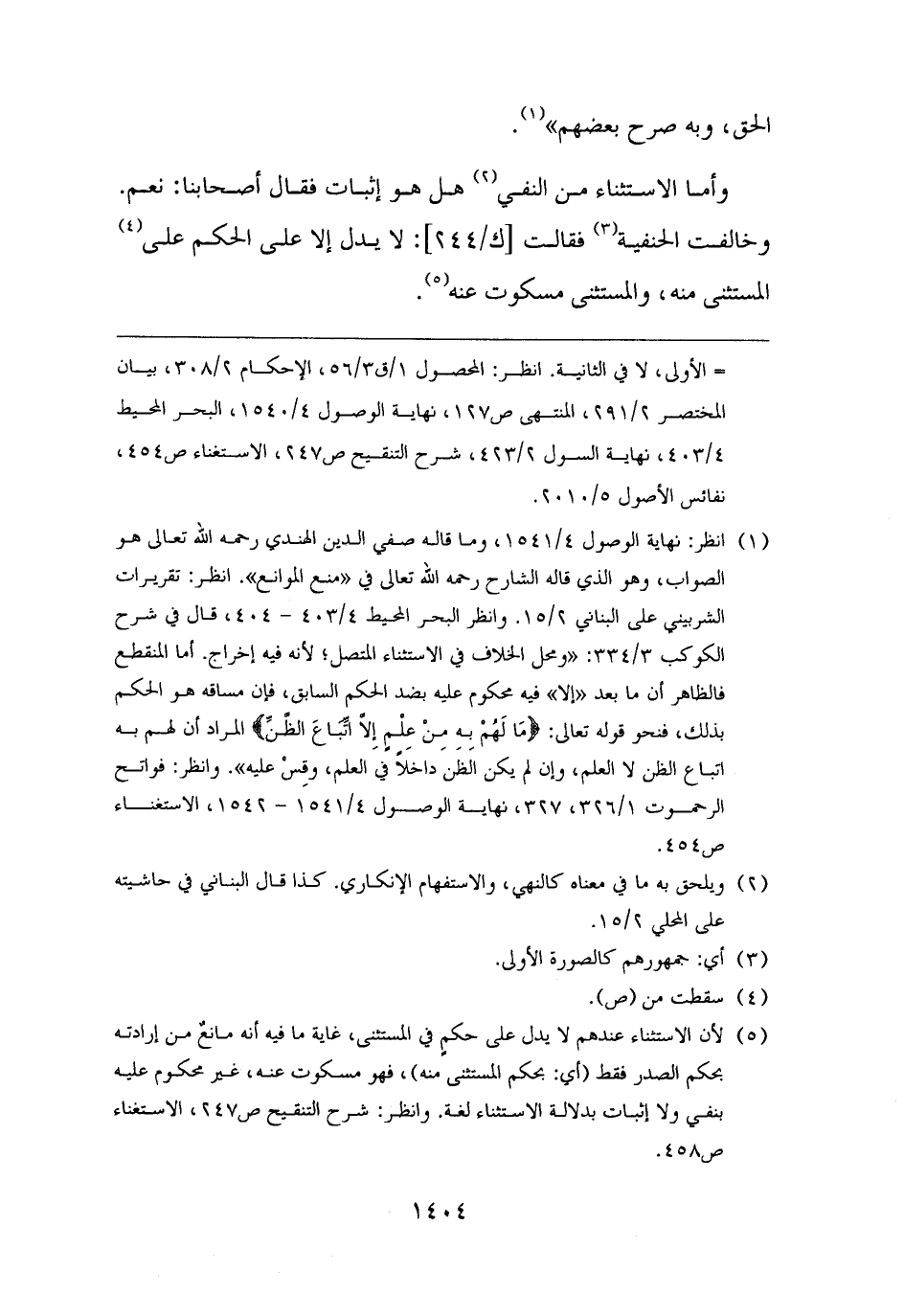(¬٥) لأن الاستثناء عندهم لا يدل على حكمٍ في المستثنى، غاية ما فيه أنه مانعٌ من إرادته بحكم الصدر فقط (أي: بحكم المستثنى منه)، فهو مسكوت عنه، غير محكوم عليه بنفي ولا إثبات بدلالة الاستثناء لغة. وانظر: شرح التنقيح ص ٢٤٧، الاستغناء ص ٤٥٨.