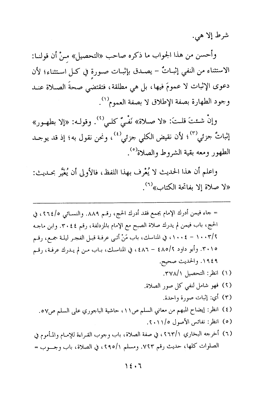وأحسن من هذا الجواب ما ذكره صاحب "التحصيل" مِنْ أن قولنا: الاستثناء من النفي إثباتٌ - يصدق بإثبات صورةٍ في كل استثناء؛ لأن دعوى الإثبات لا عمومَ فيها، بل هي مطلقة، فتقتضي صحةَ الصلاة عند وجود الطهارة بصفة الإطلاق لا بصفة العموم (¬١).