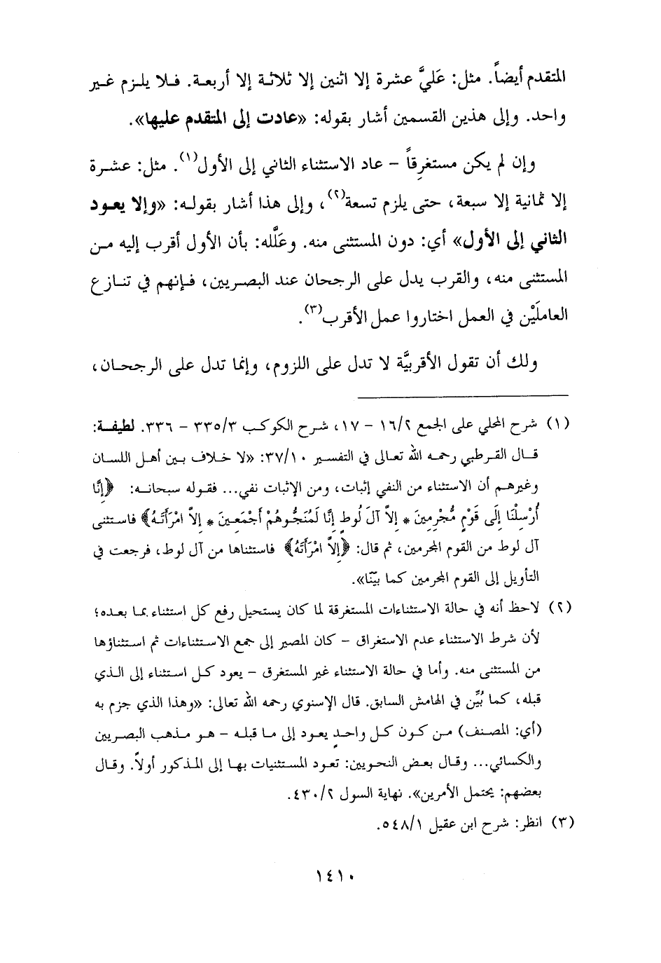 (¬٢) لاحظ أنه في حالة الاستثناءات المستغرقة لما كان يستحيل رفع كل استثناء بما بعده؛ لأن شرط الاستثناء عدم الاستغراق - كان المصير إلى جمع الاستثناءات ثم استثناؤها من المستثنى منه. وأما في حالة الاستثناء غير المستغرق - يعود كل استثناء إلى الذي قبله، كما بُيِّن في الهامش السابق. قال الإسنوي رحمه الله تعالى: "وهذا الذي جزم به (أي: المصنف) من كون كل واحدٍ يعود إلى ما قبله - هو مذهب البصريين والكسائي. . . وقال بعض النحويين: تعود المستثنيات بها إلى المذكور أولًا. وقال بعضهم: يحتمل الأمرين". نهاية السول ٢/ ٤٣٠.