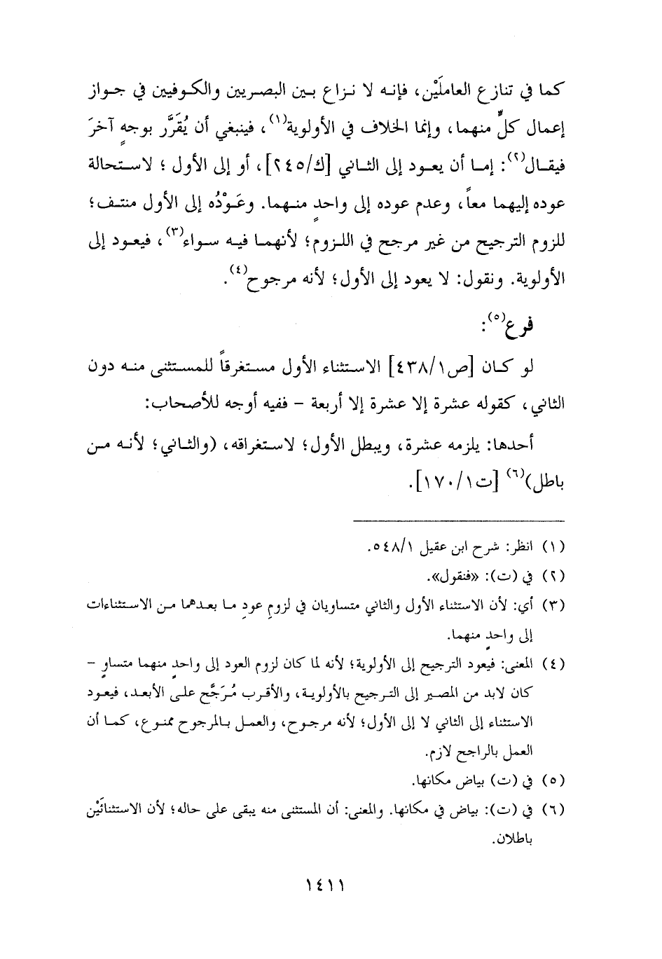 (¬٤) المعنى: فيعود الترجيح إلى الأولوية؛ لأنه لما كان لزوم العود إلى واحد منهما متساوٍ - كان لا بد من المصير إلى الترجيح بالأولوية، والأقرب مُرَجَّح على الأبعد، فيعود الاستثناء إلى الثاني لا إلى الأول؛ لأنه مرجوح، والعمل بالمرجوح ممنوع، كما أن العمل بالراجح لازم.