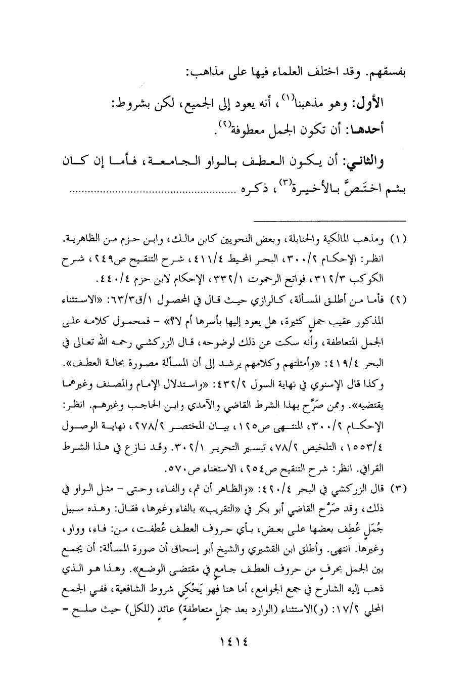 (¬٢) فأما من أطلق المسألة، كالرازي حيث قال في المحصول ١/ ق ٣/ ٦٣: "الاستثناء المذكور عقيب جملٍ كثيرة، هل يعود إليها بأسرها أم لا؟ " - فمحمول كلامه على الجمل المتعاطفة، وأنه سكت عن ذلك لوضوحه، قال الزركشي رحمه الله تعالى في البحر ٤/ ٤١٩: "وأمثلتهم وكلامهم يرشد إلى أن المسألة مصورة بحالة العطف". وكذا قال الإسنوي في نهاية السول ٢/ ٤٣٢: "واستدلال الإمام والمصنف وغيرهما يقتضيه". وممن صَرَّح بهذا الشرط القاضي والآمدي وابن الحاجب وغيرهم. انظر: الإحكام ٢/ ٣٠٠، المنتهى ص ١٢٥، بيان المختصر ٢/ ٢٧٨، نهاية الوصول ٤/ ١٥٥٣، التلخيص ٢/ ٧٨، تيسير التحرير ١/ ٣٠٢. وقد نازع في هذا الشرط القرافي. انظر: شرح التنقيح ص ٢٥٤، الاستغناء ص ٥٧٠.