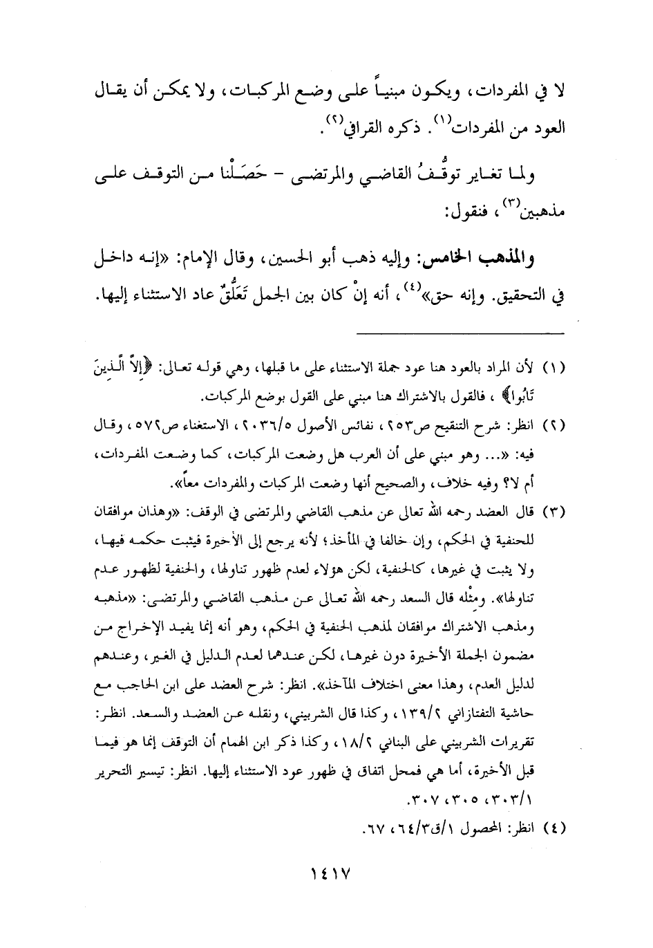 (¬٣) قال العضد رحمه الله تعالى عن مذهب القاضي والمرتضى في الوقف: "وهذان موافقان للحنفية في الحكم، وإن خالفا في المأخذ؛ لأنه يرجع إلى الأخيرة فيثبت حكمه فيها، ولا يثبت في غيرها، كالحنفية، لكن هؤلاء لعدم ظهور تناولها، والحنفية لظهور عدم تناولها". ومِثْله قال السعد رحمه الله تعالى عن مذهب القاضي والمرتضى: "مذهبه ومذهب الاشتراك موافقان لمذهب الحنفية في الحكم، وهو أنه إنما يفيد الإخراج من مضمون الجملة الأخيرة دون غيرها، لكن عندهما لعدم الدليل في الغير، وعندهم لدليل العدم، وهذا معنى اختلاف المآخذ". انظر: شرح العضد على ابن الحاجب مع حاشية التفتازاني ٢/ ١٣٩، وكذا قال الشربيني، ونقله عن العضد والسعد. انظر: تقريرات الشربيني على البناني ٢/ ١٨، وكذا ذكر ابن الهمام أن التوقف إنما هو فيما قبل الأخيرة، أما هي فمحل اتفاق في ظهور عود الاستثناء إليها. انظر: تيسير التحرير ١/ ٣٠٣, ٣٠٥, ٣٠٧.