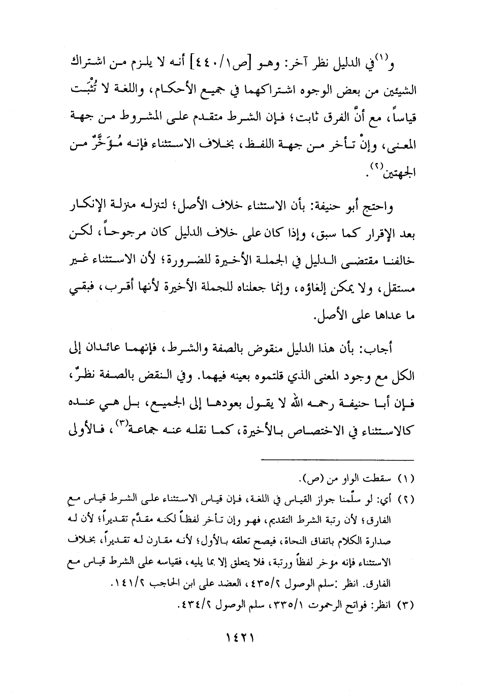 و (¬١) في الدليل نظر آخر: وهو أنه لا يلزم من اشتراك الشيئين من بعض الوجوه اشتراكهما في جميع الأحكام، واللغة لا تُثْبَت قياسًا، مع أنَّ الفرق ثابت؛ فإن الشرط متقدم على المشروط من جهة المعنى، وإنْ تأخر من جهة اللفظ، بخلاف الاستثناء فإنه مُؤَخَّرٌ من الجهتين (¬٢).