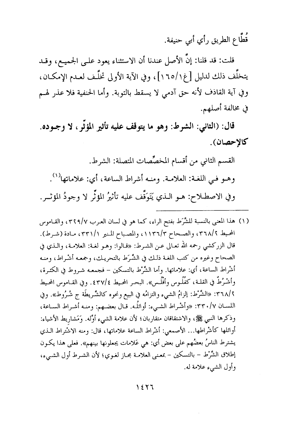 (¬١) هذا المعنى بالنسبة للشَّرَط بفتح الراء، كما هو في لسان العرب ٧/ ٣٢٩، والقاموس المحيط ٢/ ٣٦٨، والصحاح ٣/ ١١٣٦، والمصباح المنير ١/ ٣٣١، مادة (شرط). قال الزركشي رحمه الله تعالى عن الشرط: "قالوا: وهو لغة: العلامة، والذي في الصحاح وغيره من كتب اللغة ذلك في الشَّرَط بالتحريك، وجمعه أشْراط، ومنه أشْراط الساعة، أي: علاماتها. وأما الشَّرْط بالتسكين - فجمعه شروط في الكثرة، وأشْرُطٌ في القلة، كفُلُوس وأفْلُس". البحر المحيط ٤/ ٤٣٧. وفي القاموس المحيط ٢/ ٣٦٨: "الشَّرْط: إلزامُ الشيء والتزامُه في البيع ونحوه كالشَّريطَة ج شُرُوط". وفي اللسان ٧/ ٣٣٠: "وأشْراط الشيء: أوائلُه. قال بعضهم: ومنه أشراط الساعة، وذكرها النبي - صلى الله عليه وسلم -، والاشتقاقان متقاربان؛ لأن علامة الشيء أوَّله. وَمَشارِيط الأشياء: أوائلها كأشْراطها. . . الأصمعي: أشْراط الساعة علاماتها، قال: ومنه الاشْتراط الذي يشترط الناسُ بعضُهم على بعض أي: هي عَلامات يجعلونها بينهم". فعلى هذا يكون إطلاق الشَّرْط - بالتسكين - بمعنى العلامة مجاز لغوي؛ لأن الشرط أول الشيء، وأول الشيء علامة له.
