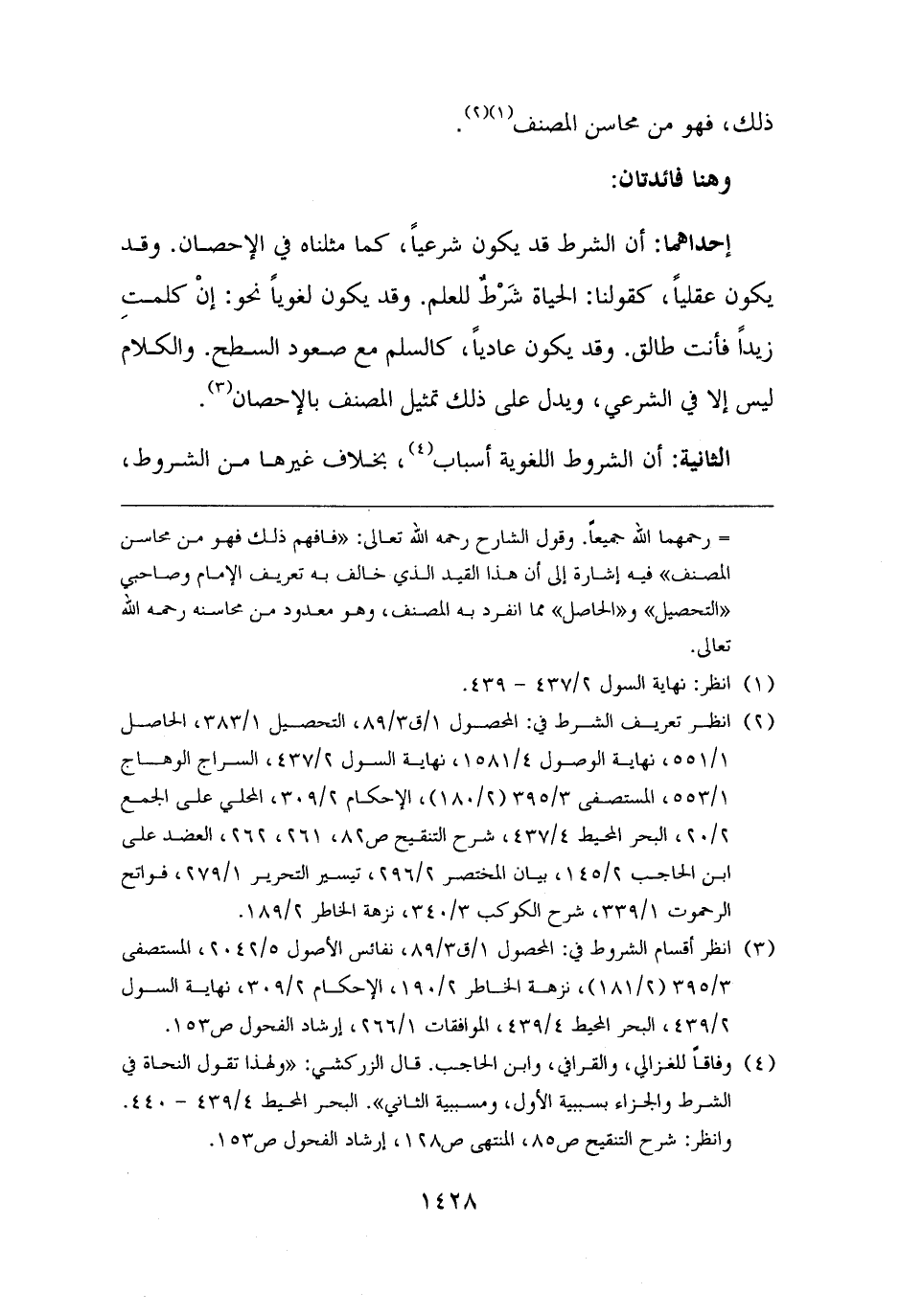 (¬٣) انظر أقسام الشروط في: المحصول ١/ ق ٣/ ٨٩، نفائس الأصول ٥/ ٢٠٤٢، المستصفى ٣/ ٣٩٥ (٢/ ١٨١)، نزهة الخاطر ٢/ ١٩٠، الإحكام ٢/ ٣٠٩، نهاية السول ٢/ ٤٣٩، البحر المحيط ٤/ ٤٣٩، الموافقات ١/ ٢٦٦، إرشاد الفحول ص ١٥٣.